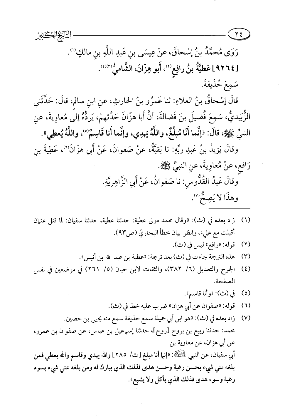 محمد: حدثنا ربيع بن بروح [روح]، حدثنا إسماعيل بن عباس، عن صفوان بن عمرو، عن أبي هزان، عن معاوية بن أبي سفيان، عن النبي عليه السلام: "إنما أنا مبلغ واللَّه يهدي وقاسم واللَّه يعطي فمن بلغه مني شيء بحسن رغبة وحسن هدى فذلك الذي يبارك له ومن بلغه عني شيء بسوء رغبة وسوء هدى فذلك الذي يأكل ولا يشبع".