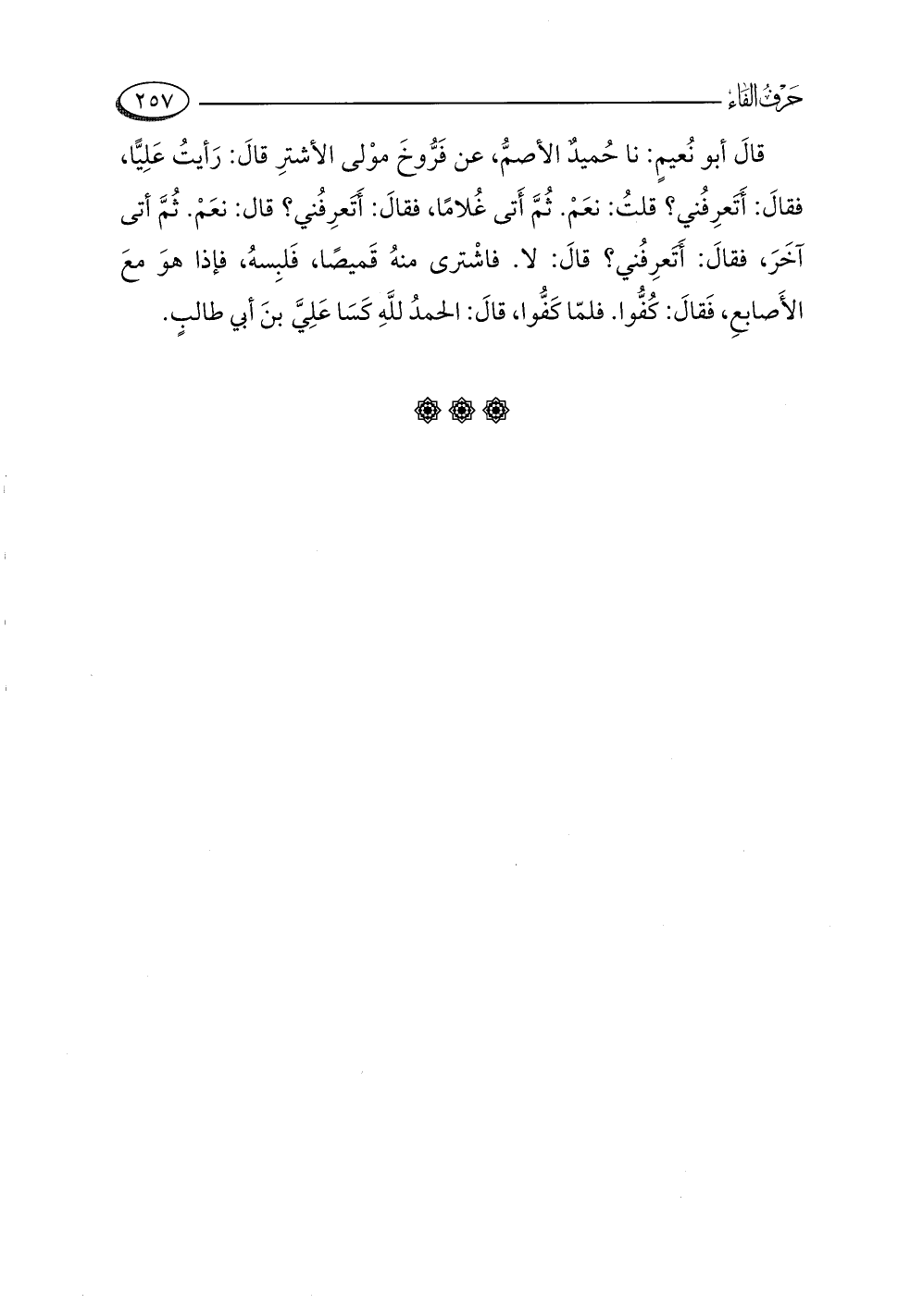 قالَ أبو نُعيمٍ: نا حُميدٌ الأصمُّ، عن فَرُّوخَ موْلى الأشترِ قالَ: رَأيتُ عَلِيًّا، فقالَ: أَتَعرِفُني؟ قلتُ: نعَمْ. ثُمَّ أَتى غُلامًا، فقالَ: أَتَعرِفُني؟ قال: نعَمْ. ثُمَّ أتى آخَرَ، فقالَ: أَتَعرِفُني؟ قالَ: لا. فاشْترى منهُ قَميصًا، فَلبِسهُ، فإذا هوَ معَ الأَصابعِ، فَقالَ: كُفُّوا. فلمّا كَفُّوا، قالَ: الحمدُ للَّهِ كَسَا عَلِيَّ بنَ أبي طالبٍ.