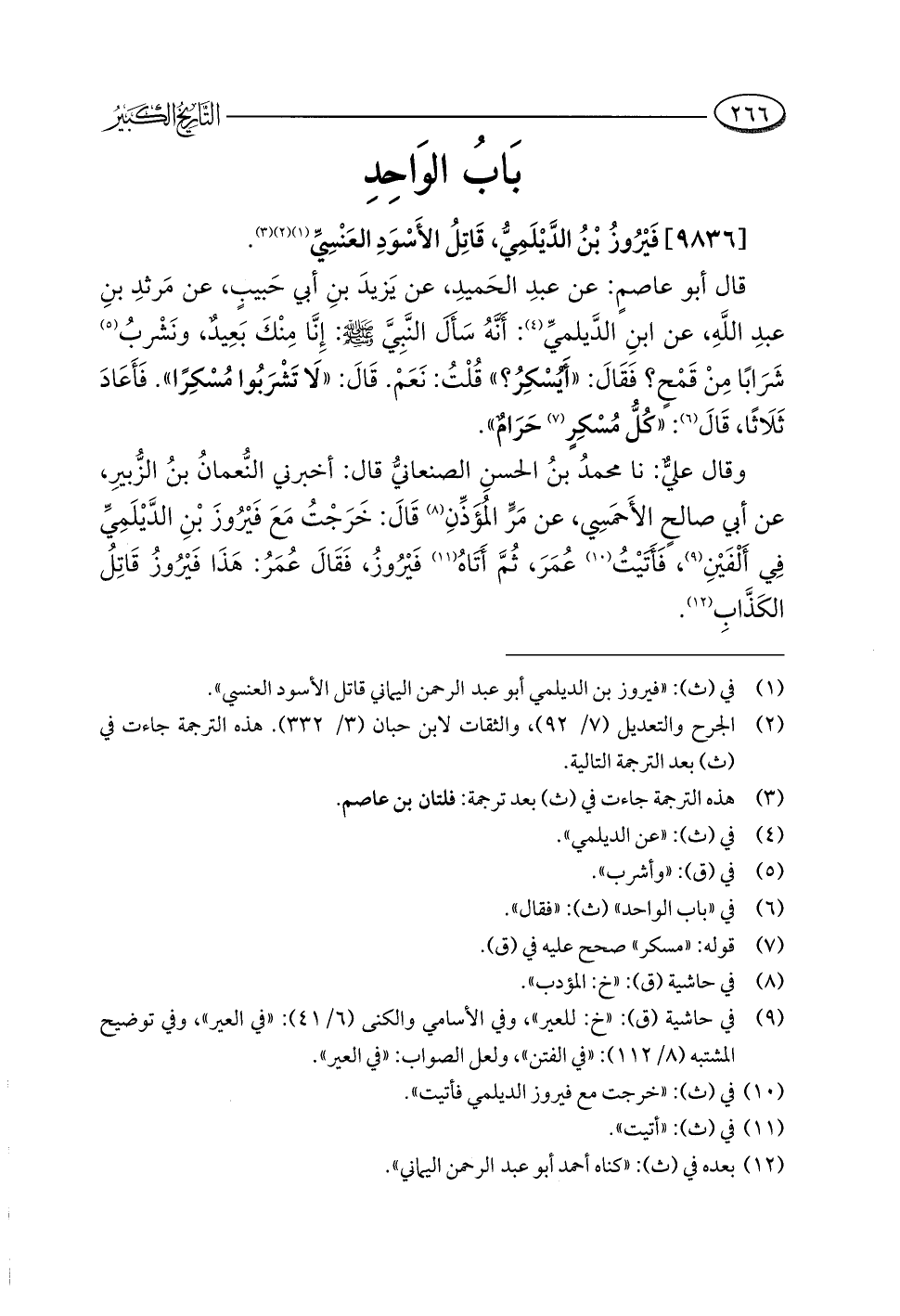 وقال عليٌّ: نا محمدُ بنُ الحَسنِ الصنعانيُّ قال: أخبرني النُّعمانُ بنُ الزُّبيرِ، عن أبي صالحٍ الأَحمَسِي، عن مَرٍّ المُؤَذِّنِ (¬٨) قَالَ: خَرَجْتُ مَعَ فَيْرُوزَ بْنِ الدَّيْلَمِيِّ فِي أَلْفَيْنِ (¬٩)، فَأَتَيْتُ (¬١٠) عُمَرَ، ثُمَّ أَتَاهُ (¬١١) فَيْرُوزُ، فَقَالَ عُمَرُ: هَذَا فَيْرُوزُ قَاتِلُ الكَذَّابِ (¬١٢).