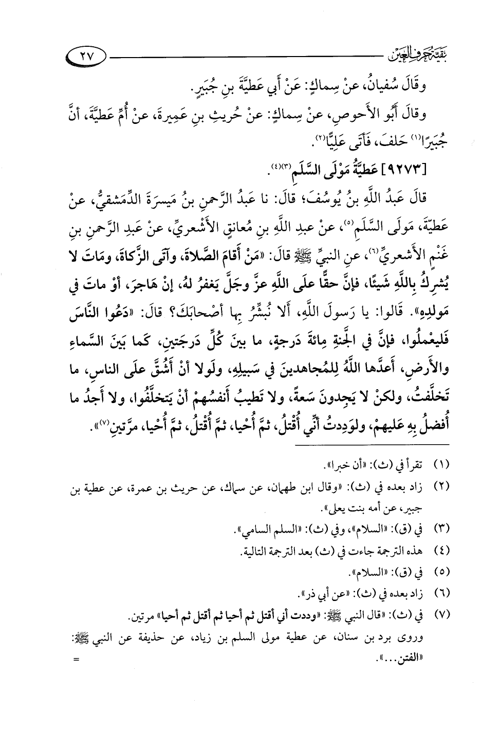 قالَ عَبدُ اللَّهِ بنُ يُوسُفَ؛ قالَ: نا عَبدُ الرَّحمنِ بنُ مَيسرَةَ الدِّمَشقيُّ، عنْ عَطيّةَ، مَولَى السَّلَمِ (¬٥)، عنْ عبدِ اللَّهِ بنِ مُعانقٍ الأَشْعريِّ، عنْ عَبدِ الرَّحمنِ بنِ غَنْمٍ الأَشعريِّ (¬٦)، عنِ النبيِّ -صلى اللَّه عليه وسلم- قالَ: "مَنْ أَقامَ الصَّلاةَ، وآتَى الزَّكاةَ، ومَاتَ لا يُشرِكُ بِاللَّهِ شَيئًا، فإنَّ حقًّا علَى اللَّهِ عزَّ وجَلَّ يَغفرُ لهُ، إنْ هَاجرَ، أوْ ماتَ في مَولدِهِ". قَالوا: يا رَسولَ اللَّهِ، أَلا نُبشِّرُ بِها أصْحابَكَ؟ قالَ: "دَعُوا النَّاسَ فَليعْملُوا، فإنَّ في الجَّنةِ مِائةَ دَرجةٍ، ما بينَ كُلِّ دَرجَتينِ، كَما بَينَ السَّماءِ والأَرضِ، أَعدَّها اللَّهُ لِلمُجاهدينَ في سَبيلِهِ، ولَولا أنْ أَشُقَّ علَى الناسِ، ما تَخلَّفتُ، ولكنْ لا يَجِدونَ سَعةً، ولا تَطيبُ أَنفسُهمْ أنْ يَتخلَّفُوا، ولا أَجدُ ما أُفضلُ بِهِ عَليهمْ، ولوَدِدتُ أنِّي أُقْتلُ، ثمَّ أُحْيا، ثمَّ أُقْتلُ، ثمَّ أُحْيا، مرَّتينِ (¬٧) ".