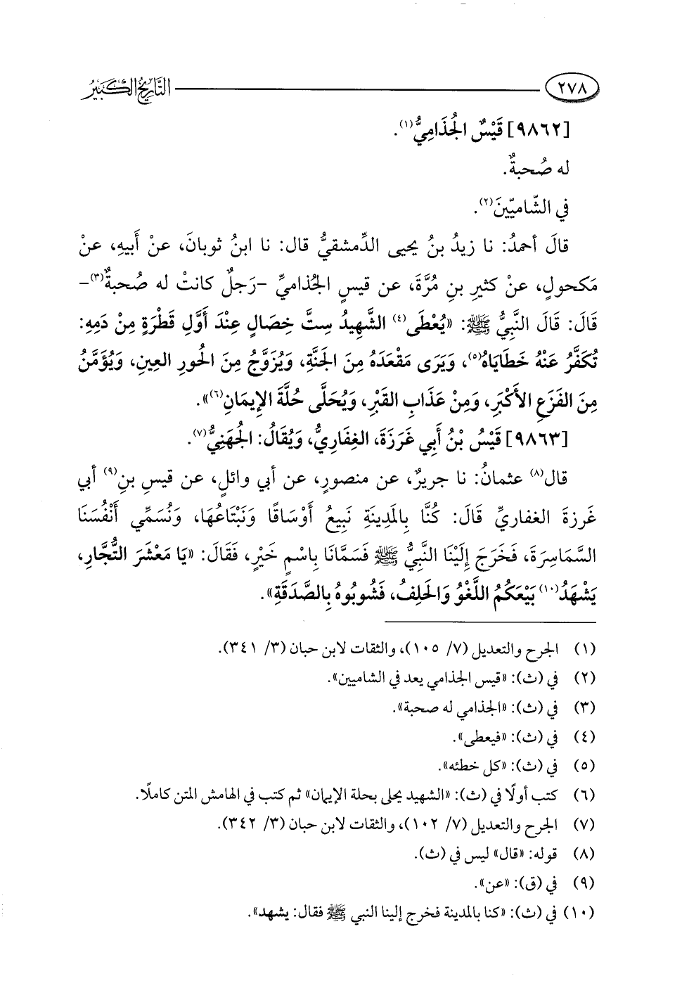 قالَ أحمدُ: نا زَيْدُ بنُ يحيى الدِّمشقيُّ قال: نا ابنُ ثوبانَ، عنْ أَبيهِ، عنْ مَكحولٍ، عنْ كثيرِ بنِ مُرَّةَ، عن قيسٍ الجُذاميِّ -رَجلٌ كانتْ له صُحبةٌ (¬٣) - قَالَ: قَالَ النَّبِيُّ -صلى اللَّه عليه وسلم-: "يُعْطَى (¬٤) الشَّهِيدُ سِتَّ خِصَالٍ عِنْدَ أَوَّلِ قَطْرَةٍ مِنْ دَمِهِ: تُكَفَّرُ عَنْهُ خَطَايَاهُ (¬٥)، وَيَرَى مَقْعَدَهُ مِنَ الجَنَّةِ، وَيُزَوَّجُ مِنَ الحُورِ العِينِ، وَيُؤَمَّنُ مِنَ الفَزَعِ الأَكبَرِ، وَمنْ عَذَابِ القَبْرِ، وَيُحَلَّى حُلَّةَ الإِيمَانِ (¬٦) ".
