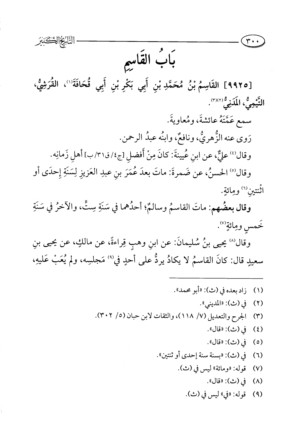 [٩٩٢٥] القَاسِمُ بْنُ مُحَمَّدِ بْنِ أَبِي بَكْرِ بْنِ أَبِي قُحَافَةَ (¬١)، القُرَشِيُّ، التَّيْمِيُّ، المَدَنِيُّ (¬٢) (¬٣).