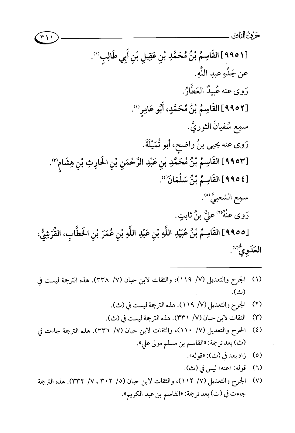 (¬٧) الجرح والتعديل (٧/ ١١٢)، والثقات لابن حبان (٥/ ٣٠٢، ٧/ ٣٣٢). هذه الترجمة جاءت في (ث) بعد ترجمة: "القاسم بن عبد الكريم".