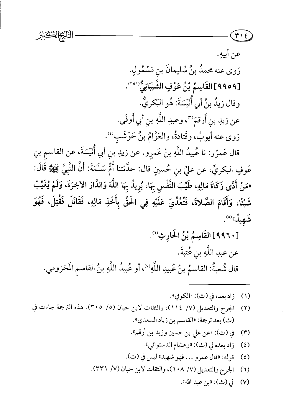 (¬٢) الجرح والتعديل (٧/ ١١٤)، والثقات لابن حبان (٥/ ٣٠٥). هذه الترجمة جاءت في (ث) بعد ترجمة: "القاسم بن زياد السعدي".