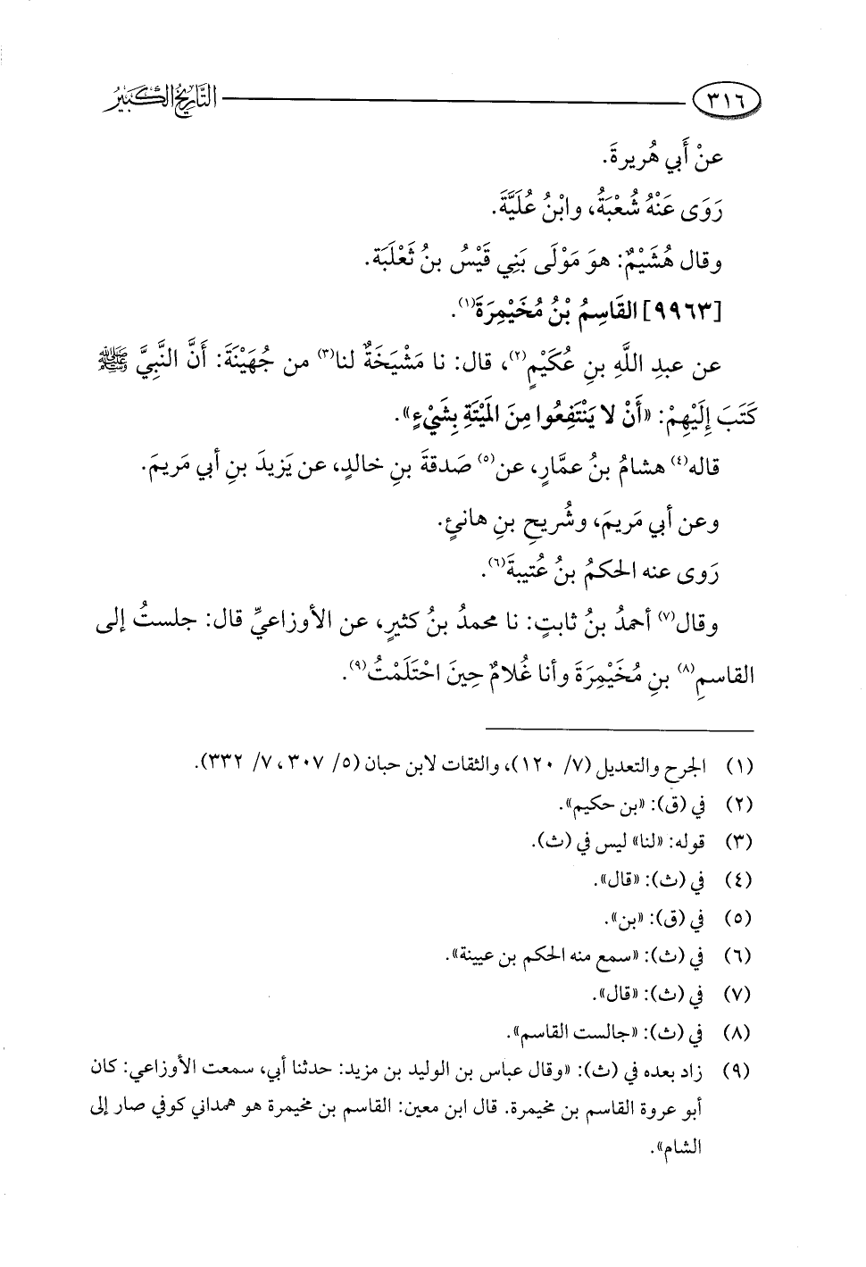 (¬٩) زاد بعده في (ث): "وقال عباس بن الوليد بن مزيد: حدثنا أبي، سمعت الأوزاعي: كان أبو عروة القاسم بن مخيمرة. قال ابن معين: القاسم بن مخيمرة هو همداني كوفي صار إلى الشام".