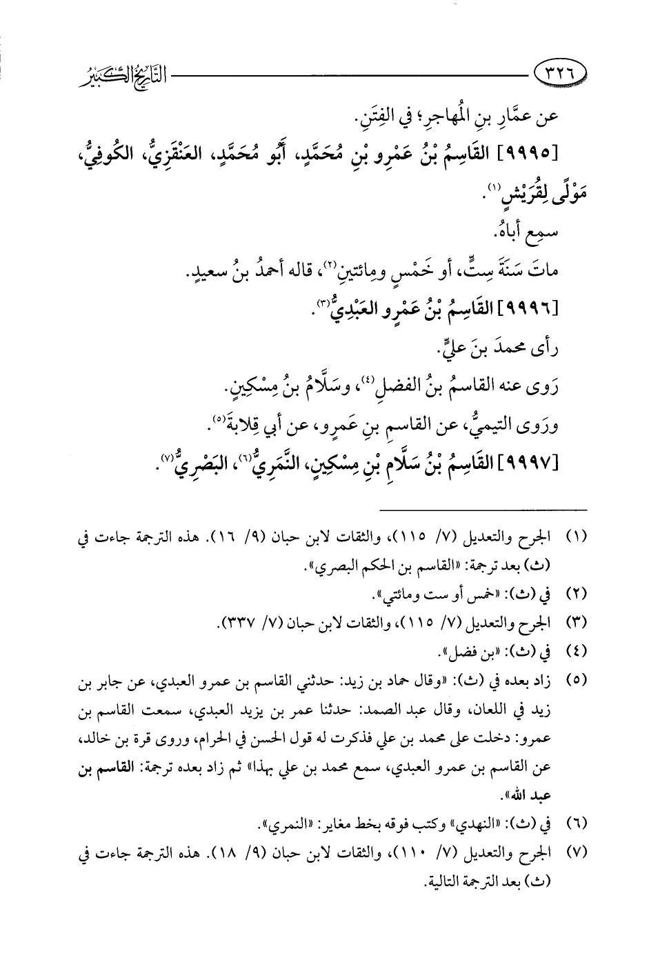 (¬١) الجرح والتعديل (٧/ ١١٥)، والثقات لابن حبان (٩/ ١٦). هذه الترجمة جاءت في (ث) بعد ترجمة: "القاسم بن الحكم البصري".