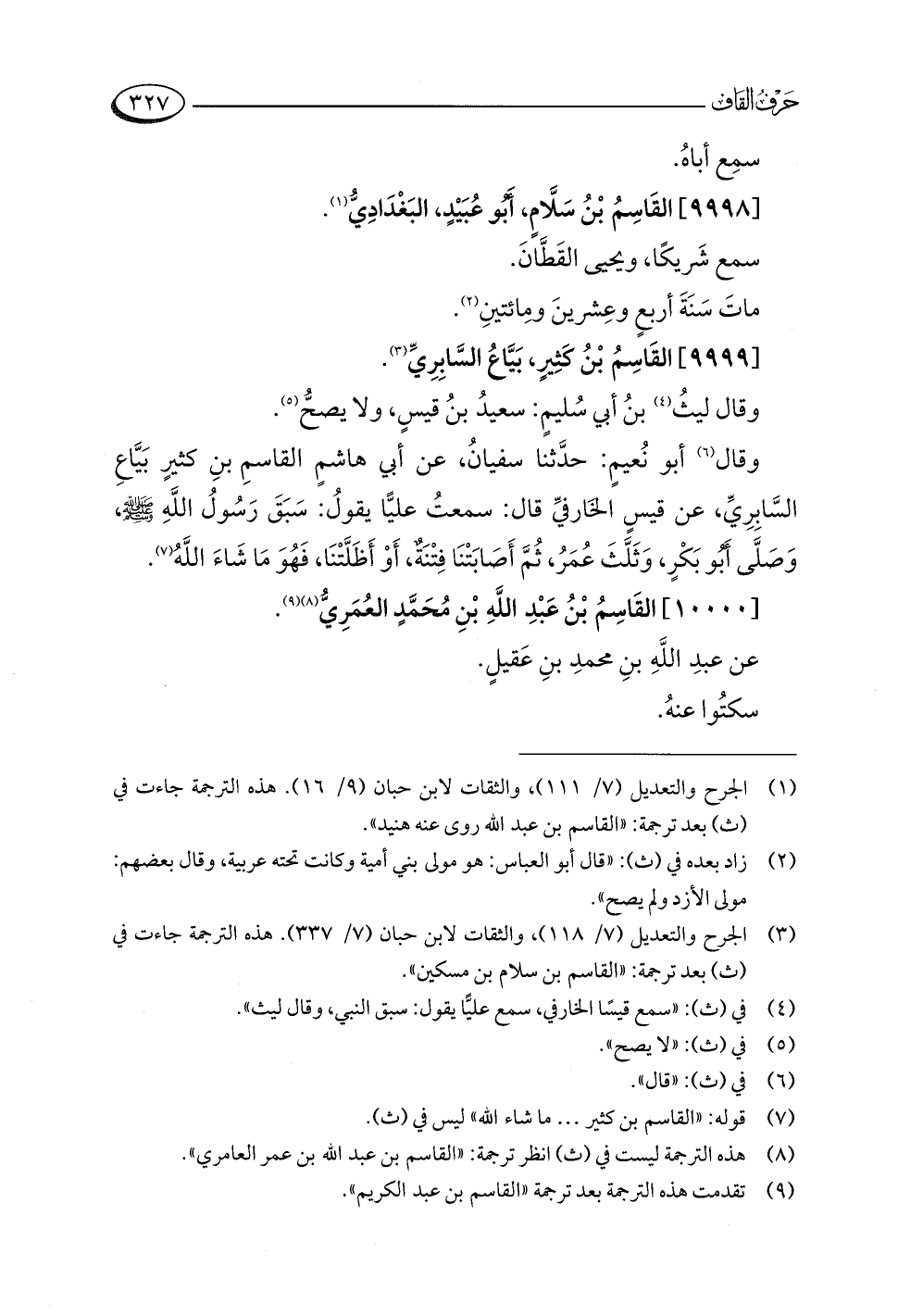 (¬٣) الجرح والتعديل (٧/ ١١٨)، والثقات لابن حبان (٧/ ٣٣٧). هذه الترجمة جاءت في (ث) بعد ترجمة: "القاسم بن سلام بن مسكين".