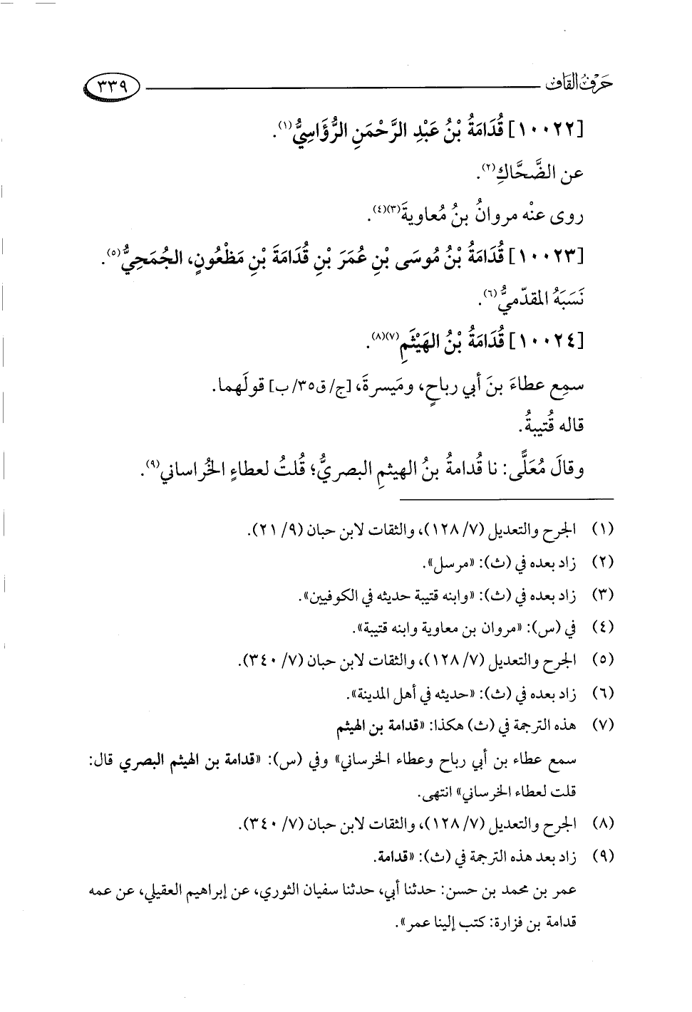 (¬٧) هذه الترجمة في (ث) هكذا: "قدامة بن الهيثم سمع عطاء بن أبي رباح وعطاء الخرساني" وفي (س): "قدامة بن الهيثم البصري قال: قلت لعطاء الخرساني" انتهى.