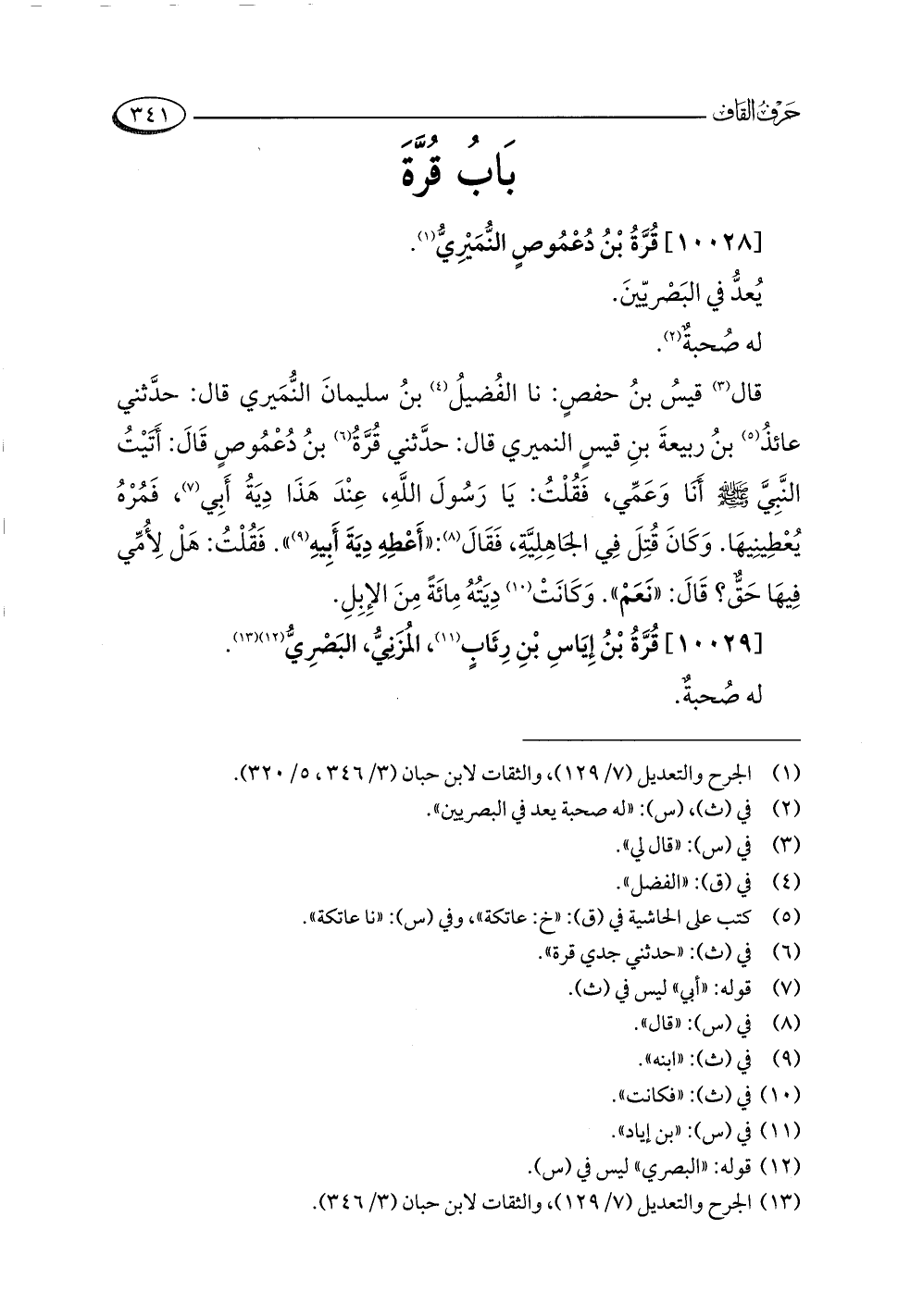 [١٠٠٢٩] قُرَّةُ بْنُ إِيَاسِ بْنِ رِئَابٍ (¬١١)، المُزَنِيُّ، البَصْرِيُّ (¬١٢) (¬١٣).