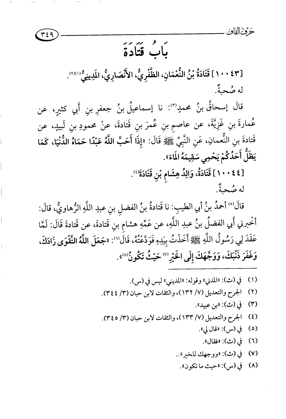[١٠٠٤٣] قَتَادَةُ بْنُ النُّعْمَانِ، الظَّفْرِيُّ، الأَنْصَارِيُّ، المَدِينِيُّ (¬١) (¬٢).