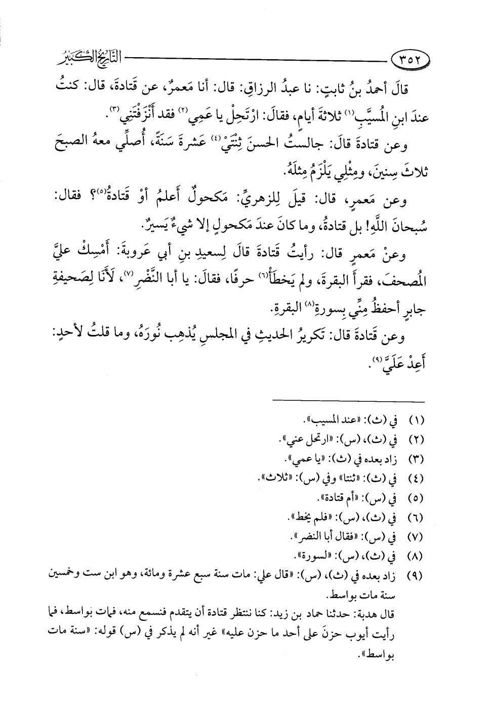 وعنْ مَعمرٍ قال: رأيتُ قَتادةَ قالَ لِسعيدِ بنِ أَبِي عَروبةَ: أَمْسِكْ عليَّ المُصحفَ، فقرأَ البقرةَ، ولم يَخطَأْ (¬٦) حرفًا، فقالَ: يا أبا النَّضرِ (¬٧)، لَأَنَا لِصَحيفةِ جابرٍ أحفظُ مِنِّىِ بِسورةِ (¬٨) البقرةِ.