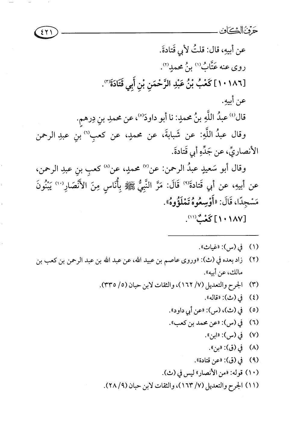 وقال أبو سَعيدٍ عبدُ الرحمن: عن (¬٧) محمدٍ، عن (¬٨) كعبِ بنِ عبدِ الرحمن، عن أبيهِ، عن أبي قَتادةَ (¬٩) قَالَ: مَرَّ النَّبِيُّ -صلى اللَّه عليه وسلم- بِأُنَاسٍ مِنَ الأَنْصَارِ (¬١٠) يَبْنُونَ مَسْجِدًا، قَالَ: "أَوْسِعُوهُ تَمْلَؤُوهُ".
