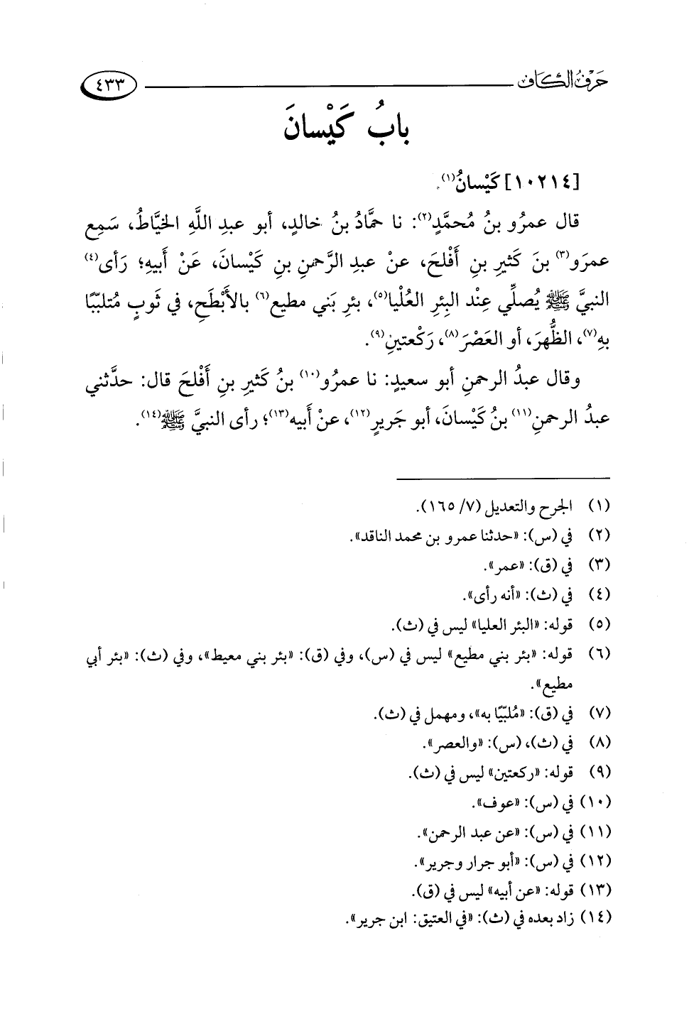 قال عمرُو بنُ مُحمَّدٍ (¬٢): نا حمَّادُ بنُ خالدٍ، أبو عبدِ اللَّهِ الخيَّاطُ، سَمِع عمرَو (¬٣) بنَ كَثيرِ بنِ أَفْلحَ، عنْ عبدِ الرَّحمنِ بنِ كَيْسانَ، عَنْ أَبيهِ؛ رَأى (¬٤) النبيَّ -صلى اللَّه عليه وسلم- يُصلِّي عِنْد البِئرِ العُلْيا (¬٥)، بئرِ بَني مطيع (¬٦) بالأَبْطَحِ، في ثَوبٍ مُتلبّبًا بهِ (¬٧)، الظُّهرَ، أو العَصْرَ (¬٨)، رَكْعتينِ (¬٩).
