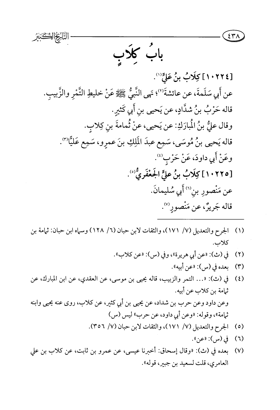 (¬١) الجرح والتعديل (٧/ ١٧١)، والثقات لابن حبان (٦/ ١٢٨) وسماه ابن حبان: ثمامة بن كلاب.