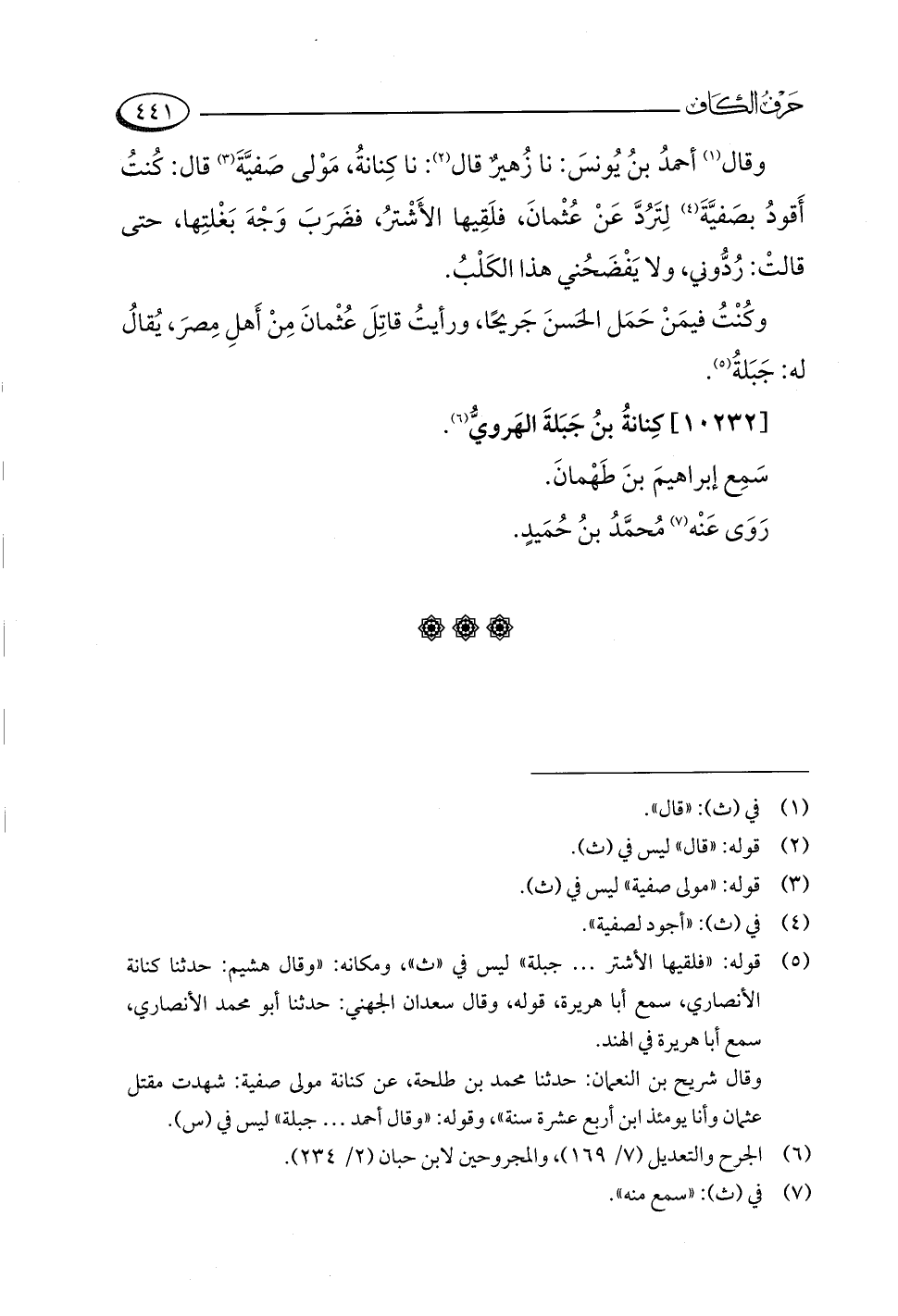 وقال شريح بن النعمان: حدثنا محمد بن طلحة، عن كنانة مولى صفية: شهدت مقتل عثمان وأنا يومئذ ابن أربع عشرة سنة"، وقوله: "وقال أحمد. . . جبلة" ليس في (س).