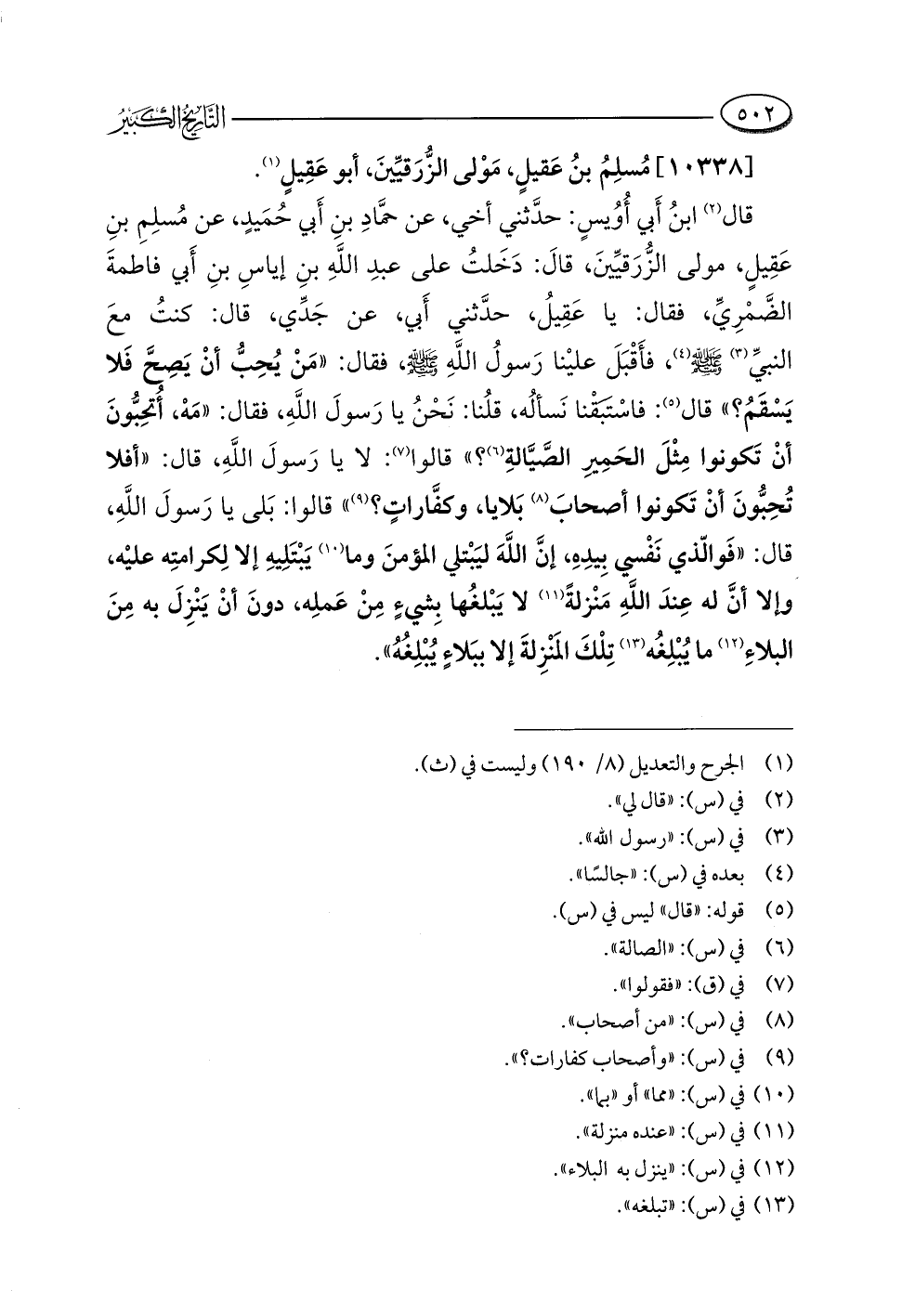 قال (¬٢) ابنُ أَبي أُوُيسٍ: حدَّثني أخي، عن حمَّادِ بنِ أَبي حُمَيدٍ، عن مُسلِمِ بنِ عَقِيلٍ، مولى الزُّرَقيِّينَ، قالَ: دَخَلتُ على عبدِ اللَّهِ بنِ إياسِ بنِ أَبي فاطمةَ الضَّمْرِيِّ، فقال: يا عَقِيلُ، حدَّثني أَبي، عن جَدِّي، قال: كنتُ معَ النبيِّ (¬٣) -صلى اللَّه عليه وسلم- (¬٤)، فأَقْبَلَ عليْنا رَسولُ اللَّهِ -صلى اللَّه عليه وسلم-، فقال: "مَنْ يُحِبُّ أنْ يَصِحَّ فَلا يَسْقَمُ؟ " قال (¬٥): فاسْتَبَقْنا نَسألُه، قلُنا: نَحْنُ يا رَسولَ اللَّهِ، فقال: "مَهْ، أُتحِبُّونَ أنْ تَكونوا مِثْلَ الحَمِير الصَّيَّالةِ (¬٦)؟ " قالوا (¬٧): لا يا رَسولَ اللَّهِ، قال: "أفلا تُحِبُّونَ أنْ تَكونوا أصحابَ (¬٨) بَلايا، وكفَّاراتٍ؟ (¬٩) " قالوا: بَلى يا رَسولَ اللَّهِ، قال: "فَوالّذي نَفْسي بِيدِهِ، إنَّ اللَّهَ ليَبْتلي المؤمنَ وما (¬١٠) يَبْتَلِيهِ إلا لِكرامتِه عليْه، وإلا أنَّ له عِندَ اللَّهِ مَنْزلةً (¬١١) لا يَبْلغُها بِشيءٍ مِنْ عَملِه، دونَ أنْ يَنْزِلَ به مِنَ البلاءِ (¬١٢) ما يُبْلِغُه (¬١٣) تِلْكَ المَنْزِلةَ إلا ببَلاءٍ يُبْلِغُهُ".
