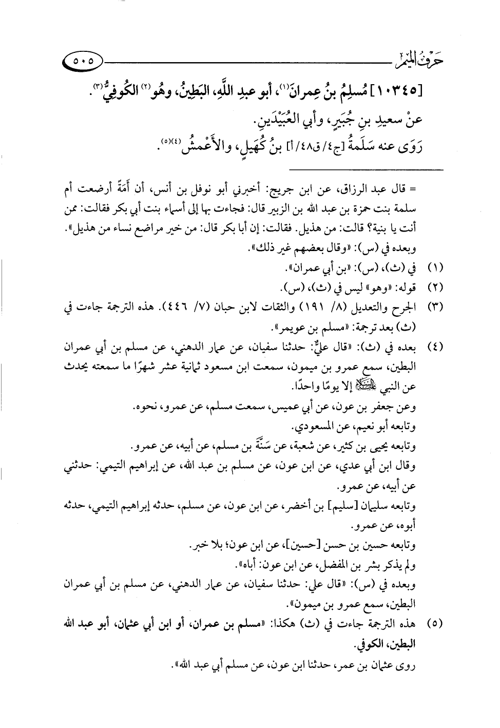 (¬٥) هذه الترجمة جاءت في (ث) هكذا: "مسلم بن عمران، أو ابن أبي عثمان، أبو عبد اللَّه البطين، الكوفي.