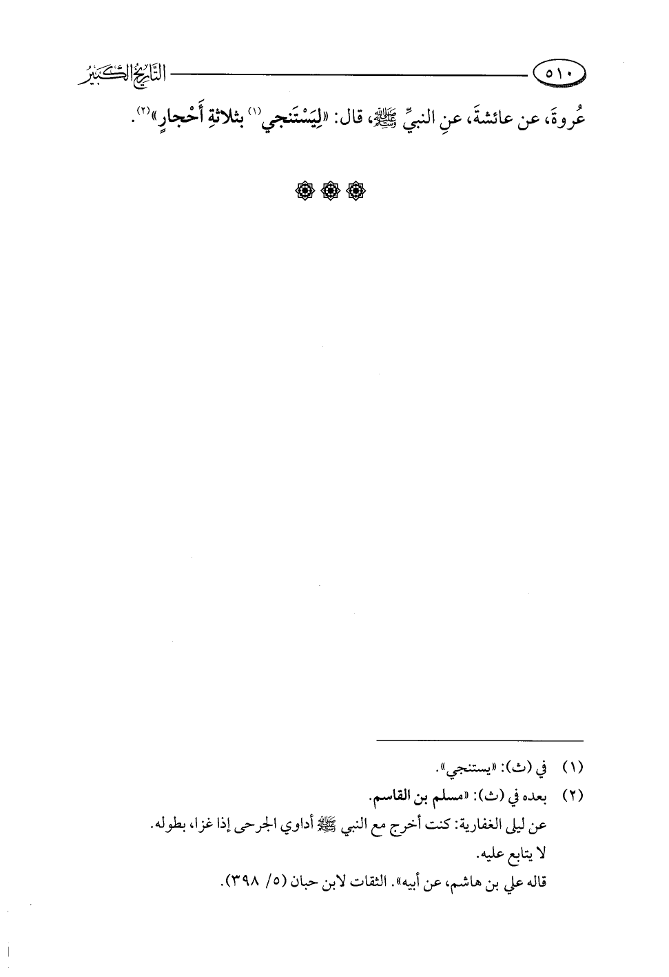 عُروةَ، عن عائشةَ، عنِ النبيِّ -صلى اللَّه عليه وسلم-، قال: "لِيَسْتَنجي (¬١) بثلاثةِ أَحْجارٍ" (¬٢).