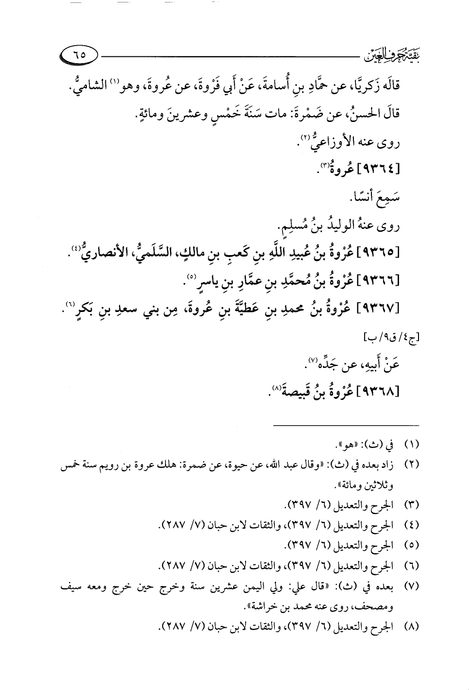 (¬٢) زاد بعده في (ث): "وقال عبد اللَّه، عن حيوة، عن ضمرة: هلك عروة بن رويم سنة خمس وثلاثين ومائة".