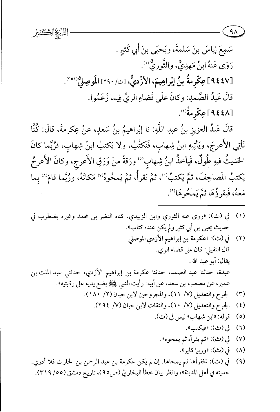 (¬٩) في (ث): "فقرأها ثم يمحاها. إن لم يكن عكرمة بن عبد الرحمن بن الحارث فلا أدري. حديثه في أهل المدينة"، وانظر بيان خطأ البخاريّ (ص ٩٥)، تاريخ دمشق (٥٥/ ٣١٩).