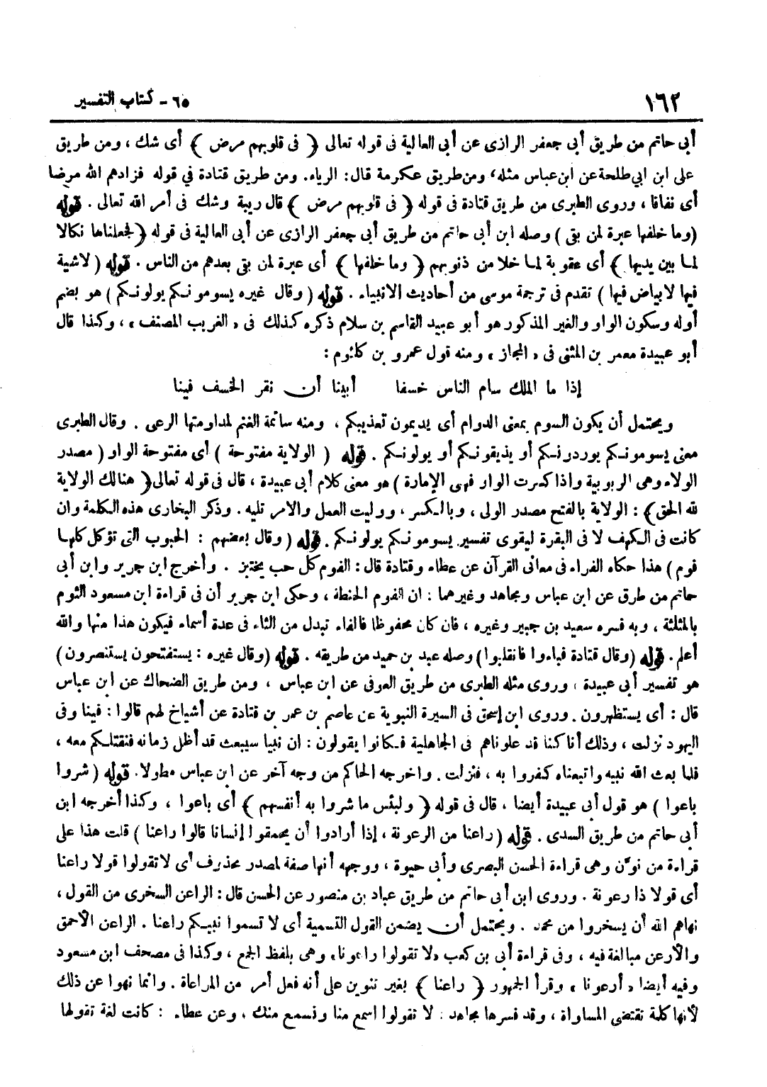 أَبِي حَاتِمٍ مِنْ طَرِيقِ أَبِي جَعْفَرٍ الرَّازِيِّ عَنْ أَبِي الْعَالِيَةِ فِي قَوْلِهِ تَعَالَى فِي قُلُوبهم مرض أَيْ شَكٌّ وَمِنْ طَرِيقِ عَلِيِّ بْنِ أَبِي طَلْحَةَ عَنِ بن عَبَّاسٍ مِثْلُهُ وَمِنْ طَرِيقِ عِكْرِمَةَ قَالَ الرِّيَاءُ وَمِنْ طَرِيقِ قَتَادَةَ فِي قَوْلِهِ فَزَادَهُمُ اللَّهُ مَرضا أَيْ نِفَاقًا وَرَوَى الطَّبَرِيُّ مِنْ طَرِيقِ قَتَادَةَ فِي قَوْلِهِ فِي قُلُوبهم مرض قَالَ رِيبَةٌ وَشَكٌّ فِي أَمْرِ اللَّهِ تَعَالَى قَوْلُهُ وَمَا خَلْفَهَا عِبْرَةً لِمَنْ بَقِيَ وَصَلَهُ بن أَبِي حَاتِمٍ مِنْ طَرِيقِ أَبِي جَعْفَرٍ الرَّازِيِّ عَنْ أَبِي الْعَالِيَةِ فِي قَوْلِهِ فَجَعَلْنَاهَا نَكَالًا لما بَين يَديهَا أَيْ عُقُوبَةً لِمَا خَلَا مِنْ ذُنُوبِهِمْ وَمَا خَلْفَهَا أَيْ عِبْرَةً لِمَنْ بَقِيَ بَعْدَهُمْ مِنَ النَّاس قَوْله لاشية فِيهَا لابياض فِيهَا تَقَدَّمَ فِي تَرْجَمَةِ مُوسَى مِنْ أَحَادِيثِ الْأَنْبِيَاءِ قَوْلُهُ وَقَالَ غَيْرُهُ يَسُومُونَكُمْ يُولُونَكُمْ هُوَ بِضَمِّ أَوَّلِهِ وَسُكُونِ الْوَاوِ وَالْغَيْرُ الْمَذْكُورُ هُوَ أَبُو عُبَيْدٍ الْقَاسِمُ بْنُ سَلَّامٍ ذَكَرَهُ كَذَلِكَ فِي الْغَرِيبِ الْمُصَنَّفِ وَكَذَا قَالَ أَبُو عُبَيْدَةَ مَعْمَرُ بْنُ الْمُثَنَّى فِي الْمَجَازِ وَمِنْهُ قَوْلُ عَمْرِو بْنِ كُلْثُومٍ إِذَا مَا الْمَلْكُ سَامَ النَّاسَ خَسْفًا أَبَيْنَا أَنْ نُقِرَّ الْخَسْفَ فِينَا وَيَحْتَمِلُ أَنْ يَكُونَ السَّوْمُ بِمَعْنَى الدَّوَامِ أَيْ يُدِيمُونَ تَعْذِيبَكُمْ وَمِنْهُ سَائِمَةُ الْغَنَمِ لِمُدَاوَمَتِهَا الرَّعْيَ وَقَالَ الطَّبَرِيُّ مَعْنَى يَسُومُونَكُمْ يُورِدُونَكُمْ أَوْ يُذِيقُونَكُمْ أَوْ يُولُونَكُمْ قَوْلُهُ الْوَلَايَةُ مَفْتُوحَةً أَيْ مَفْتُوحَةَ الْوَاوِ مَصْدَرُ الْوَلَاءِ وَهِيَ الرُّبُوبِيَّةُ وَإِذَا كُسِرَتِ الْوَاوُ فَهِيَ الْإِمَارَةُ هُوَ مَعْنَى كَلَامِ أَبِي عُبَيْدَةَ قَالَ فِي قَوْلِهِ تَعَالَى هُنَالِكَ الْوَلَايَةُ لله الْحق الْوَلَايَةُ بِالْفَتْحِ مَصْدَرُ الْوَلْيِ وَبِالْكَسْرِ وَوَلِيتَ الْعَمَلَ وَالْأَمْرَ تَلِيهِ وَذَكَرَ الْبُخَارِيُّ هَذِهِ الْكَلِمَةَ وَإِنْ كَانَتْ فِي الْكَهْفِ لَا فِي الْبَقَرَةِ لِيُقَوِّيَ تَفْسِيرَ يَسُومُونَكُمْ يُولُونَكُمْ قَوْلُهُ وَقَالَ بَعْضُهُمُ الْحُبُوبُ الَّتِي تُؤْكَلُ كُلُّهَا فُومٌ هَذَا حَكَاهُ الْفَرَّاءُ فِي مَعَانِي الْقُرْآنِ عَنْ عَطَاءٍ وَقَتَادَةَ قَالَ الفوم كل حب يختبز وَأخرج بن جرير وبن أبي حَاتِم من طرق عَن بن عَبَّاسٍ وَمُجَاهِدٍ وَغَيْرِهِمَا أَنَّ الْفُومَ الْحِنْطَةُ وَحَكَى بن جرير أَن فِي قِرَاءَة بن مَسْعُودٍ الثُّومُ بِالْمُثَلَّثَةِ وَبِهِ فَسَّرَهُ سَعِيدُ بْنُ جُبَيْرٍ وَغَيْرُهُ فَإِنْ كَانَ مَحْفُوظًا فَالْفَاءُ تُبَدَلُ مِنَ الثَّاءِ فِي عِدَّةِ أَسْمَاءٍ فَيَكُونُ هَذَا مِنْهَا وَاللَّهُ أَعْلَمُ قَوْلُهُ وَقَالَ قَتَادَةُ فَبَاءُوا فَانْقَلَبُوا وَصَلَهُ عَبْدُ بْنُ حُمَيْدٍ مِنْ طَرِيقِهِ قَوْلُهُ وَقَالَ غَيْرُهُ يَسْتَفْتِحُونَ يَسْتَنْصِرُونَ هُوَ تَفْسِيرُ أَبِي عُبَيْدَةَ وَرَوَى مِثْلَهُ الطَّبَرِيُّ مِنْ طَرِيقِ الْعَوْفِيّ عَن بن عَبَّاس وَمن طَرِيق الضَّحَّاك عَن بن عَبَّاس قَالَ أَي يستظهرون وروى بن إِسْحَاقَ فِي السِّيرَةِ النَّبَوِيَّةِ عَنْ عَاصِمُ بْنُ عُمَرَ بْنِ قَتَادَةَ عَنْ أَشْيَاخٍ لَهُمْ قَالُوا فِينَا وَفِي الْيَهُودِ نَزَلَتْ وَذَلِكَ أَنَّا كُنَّا قَدْ عَلَوْنَاهُمْ فِي الْجَاهِلِيَّةِ فَكَانُوا يَقُولُونَ إِنَّ نَبِيًّا سَيُبْعَثُ قَدْ أَظَلَّ زَمَانُهُ فَنَقْتُلُكُمْ مَعَهُ فَلَمَّا بَعَثَ اللَّهُ نَبِيَّهُ وَاتَّبَعْنَاهُ كَفَرُوا بِهِ فَنَزَلَتْ وَأ