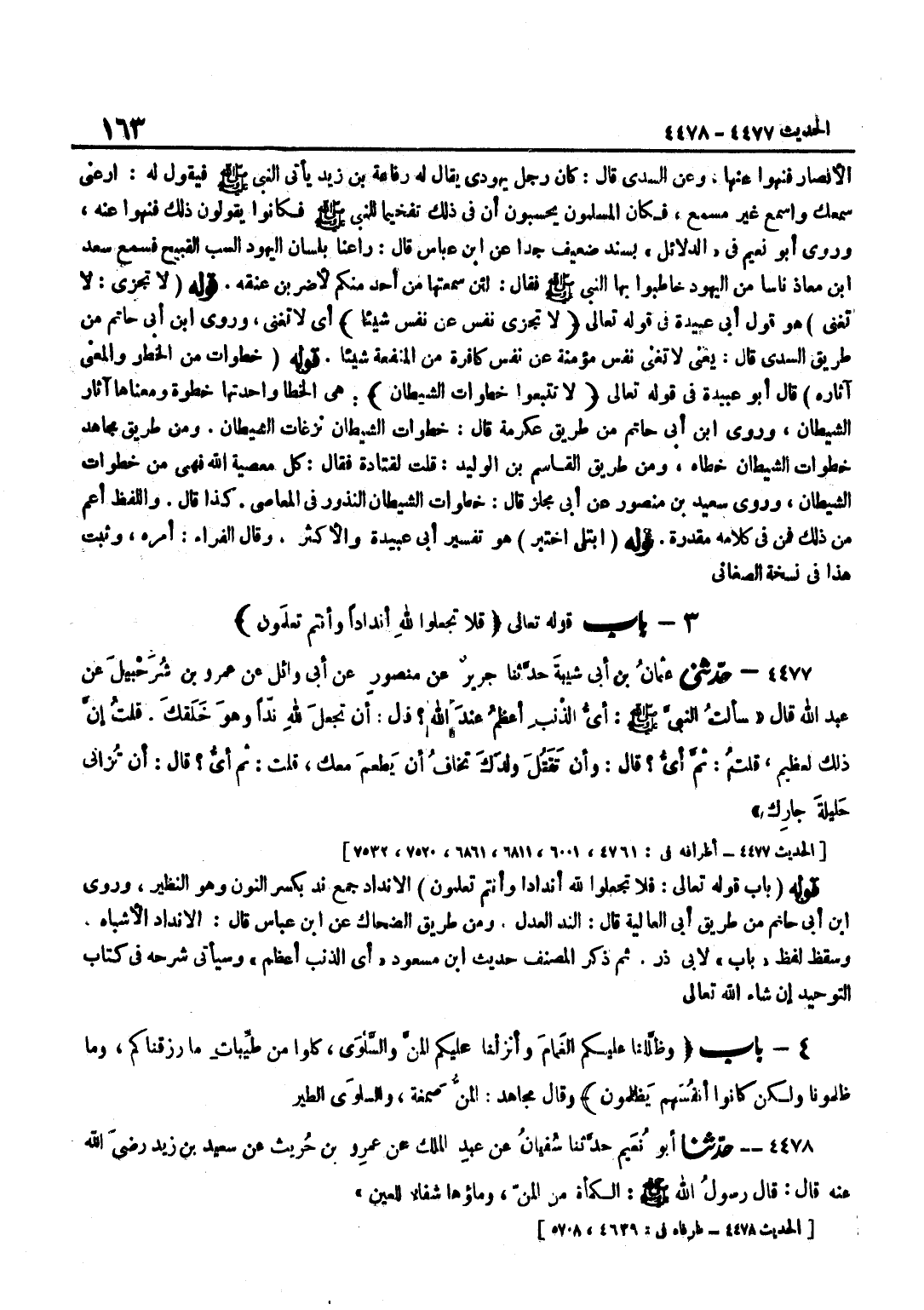 الْأَنْدَادُ جَمْعُ نِدٍّ بِكَسْرِ النُّونِ وَهُوَ النَّظِيرُ وروى بن أَبِي حَاتِمٍ مِنْ طَرِيقِ أَبِي الْعَالِيَةِ قَالَ الند الْعدْل وَمن طَرِيق الضَّحَّاك عَن بن عَبَّاسٍ قَالَ الْأَنْدَادُ الْأَشْبَاهُ وَسَقَطَ لَفْظُ بَابُ لأبي ذَر ثمَّ ذكر المُصَنّف حَدِيث بن مَسْعُودٍ أَيُّ الذَّنْبِ أَعْظَمُ وَسَيَأْتِي شَرْحُهُ فِي كِتَابِ التَّوْحِيدِ إِنْ شَاءَ اللَّهُ تَعَالَى