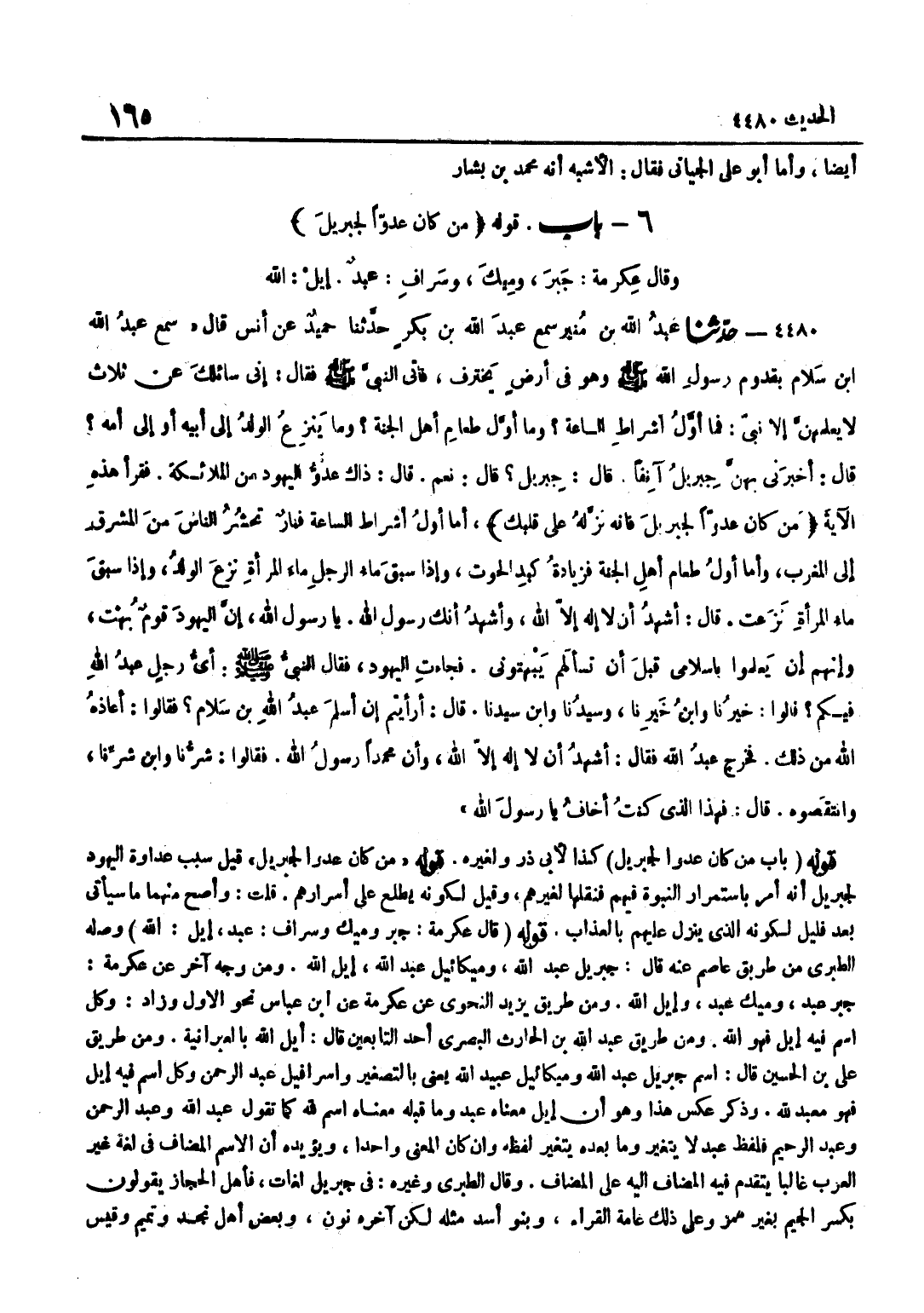 كَذَا لِأَبِي ذَرٍّ وَلِغَيْرِهِ قَوْلُهُ مَنْ كَانَ عدوا لجبريل قِيلَ سَبَبُ عَدَاوَةِ الْيَهُودِ لِجِبْرِيلَ أَنَّهُ أُمِرَ بِاسْتِمْرَارِ النُّبُوَّةِ فِيهِمْ فَنَقَلَهَا لِغَيْرِهِمْ وَقِيلَ لِكَوْنِهِ يَطَّلِعُ عَلَى أَسْرَارِهِمْ قُلْتُ وَأَصَحُّ مِنْهُمَا مَا سَيَأْتِي بَعْدَ قَلِيلٍ لِكَوْنِهِ الَّذِي يَنْزِلُ عَلَيْهِمْ بِالْعَذَابِ قَوْلُهُ قَالَ عِكْرِمَةُ جِبْرُ وَمِيكُ وَسِرَافُ عبد إيل الله وَصله الطَّبَرِيّ من طَرِيقِ عَاصِمٍ عَنْهُ قَالَ جِبْرِيلُ عَبْدُ اللَّهِ وَمِيكَائِيلُ عَبْدُ اللَّهِ إِيلُ اللَّهُ وَمِنْ وَجْهٍ آخَرَ عَنْ عِكْرِمَةَ جِبْرُ عَبْدٌ وَمِيكَ عَبْدٌ وَإِيلُ اللَّهُ وَمِنْ طَرِيقِ يَزِيدَ النَّحْوِيِّ عَنْ عِكْرِمَة عَن بن عَبَّاسٍ نَحْوَ الْأَوَّلِ وَزَادَ وَكُلُّ اسْمٍ فِيهِ إِيلُ فَهُوَ اللَّهُ وَمِنْ طَرِيقِ عَبْدِ اللَّهِ بْنِ الْحَارِثِ الْبَصْرِيِّ أَحَدُ التَّابِعِينَ قَالَ إِيلُ اللَّهُ بِالْعِبْرَانِيَّةِ وَمِنْ طَرِيقِ عَلِيِّ بْنِ الْحُسَيْنِ قَالَ اسْمُ جِبْرِيلَ عَبْدُ اللَّهِ وَمِيكَائِيلَ عُبَيْدُ اللَّهِ يَعْنِي بِالتَّصْغِيرِ وَإِسْرَافِيلَ عَبْدُ الرَّحْمَنِ وَكُلُّ اسْمٍ فِيهِ إِيلُ فَهُوَ مُعَبَّدٌ لِلَّهِ وَذُكِرَ عَكْسَ هَذَا وَهُوَ أَنَّ إِيلَ مَعْنَاهُ عَبْدٌ وَمَا قَبْلَهُ مَعْنَاهُ اسْمُ لِلَّهِ كَمَا تَقُولُ عَبْدُ اللَّهِ وَعَبْدُ الرَّحْمَنِ وَعَبْدُ الرَّحِيمِ فَلَفْظُ عَبْدٍ لَا يَتَغَيَّرُ وَمَا بَعْدَهُ يَتَغَيَّرُ لَفْظُهُ وَإِنْ كَانَ الْمَعْنَى وَاحِدًا وَيُؤَيِّدُهُ أَنَّ الِاسْمَ الْمُضَافَ فِي لُغَةِ غَيْرِ الْعَرَبِ غَالِبًا يَتَقَدَّمُ فِيهِ الْمُضَافُ إِلَيْهِ عَلَى الْمُضَافِ وَقَالَ الطَّبَرِيُّ وَغَيْرُهُ فِي جِبْرِيلَ لُغَاتٌ فَأَهْلُ الْحِجَازِ يَقُولُونَ بِكَسْرِ الْجِيمِ بِغَيْرِ هَمْزٍ وَعَلَى ذَلِكَ عَامَّةُ الْقُرَّاءِ وَبَنُو أَسَدٍ مِثْلُهُ لَكِنْ آخِرُهُ نُونٌ وَبَعض أهل نجد وَتَمِيم