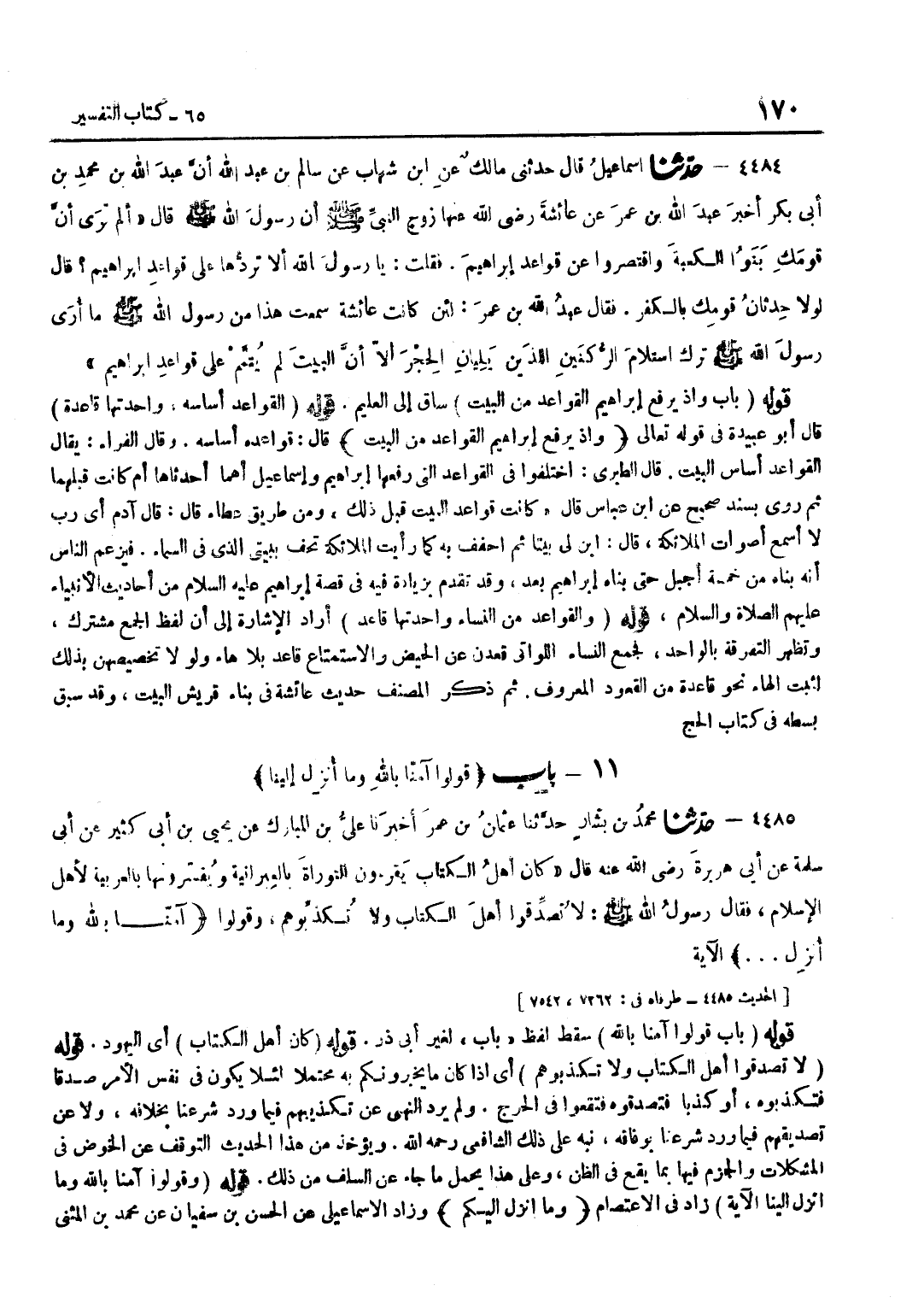 [4485] قَوْلُهُ كَانَ أَهْلُ الْكِتَابِ أَيْ الْيَهُودُ قَوْلُهُ لَا تُصَدِّقُوا أَهْلَ الْكِتَابِ وَلَا تُكَذِّبُوهُمْ أَيْ إِذَا كَانَ مَا يُخْبِرُونَكُمْ بِهِ مُحْتَمَلًا لِئَلَّا يَكُونَ فِي نَفْسِ الْأَمْرِ صِدْقًا فَتُكَذِّبُوهُ أَوْ كَذِبًا فَتُصَدِّقُوهُ فَتَقَعُوا فِي الْحَرَجِ وَلَمْ يَرِدِ النَّهْيُ عَن تكذيبهم فِيمَا ورد شرعنا بِخِلَافِهِ وَلَا عَنْ تَصْدِيقِهِمْ فِيمَا وَرَدَ شَرْعُنَا بوفافه نَبَّهَ عَلَى ذَلِكَ الشَّافِعِيُّ رَحِمَهُ اللَّهُ وَيُؤْخَذُ مِنْ هَذَا الْحَدِيثِ التَّوَقُّفُ عَنِ الْخَوْضِ فِي الْمُشْكِلَاتِ وَالْجَزْمِ فِيهَا بِمَا يَقَعُ فِي الظَّنِّ وَعَلَى هَذَا يُحْمَلُ مَا جَاءَ عَنِ السَّلَفِ مِنْ ذَلِكَ قَوْلُهُ وَقُولُوا آمَنَّا بِاللَّهِ وَمَا أُنْزِلَ إِلَيْنَا الْآيَةَ زَادَ فِي الِاعْتِصَامِ وَمَا أُنْزِلَ إِلَيْكُمْ وَزَادَ الْإِسْمَاعِيلِيِّ عَنِ الْحَسَنِ بْنِ سُفْيَانَ عَنْ مُحَمَّدِ بْنِ الْمُثَنَّى عَنْ عُثْمَانَ بْنِ عُمَرَ بِهَذَا الْإِسْنَادِ وَمَا أُنْزِلَ إِلَيْنَا وَمَا أُنْزِلَ إِلَيْكُمْ وَإِلَهُنَا وَإِلَهُكُمْ وَاحِدٌ وَنَحْنُ لَهُ مُسلمُونَ