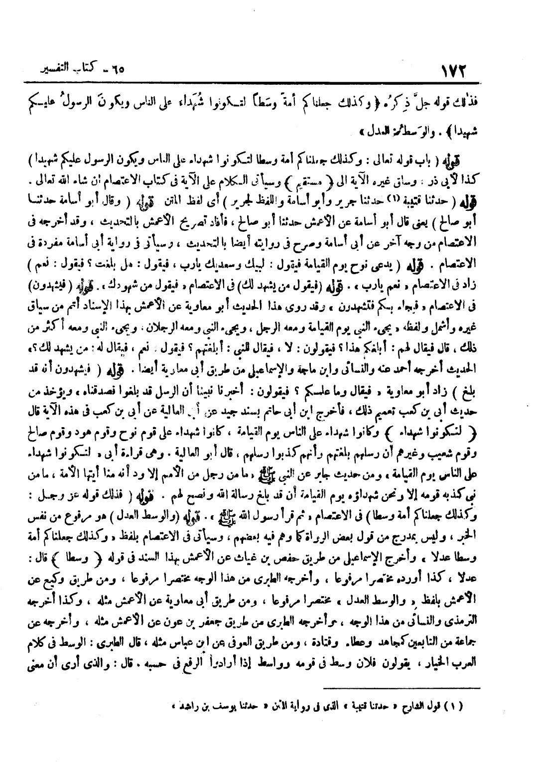 (قَوْلُهُ بَابُ قَوْلِهِ تَعَالَى وَكَذَلِكَ جَعَلْنَاكُمْ أُمَّةً وَسَطًا لِتَكُونُوا شُهَدَاءَ عَلَى النَّاسِ وَيَكُونَ الرَّسُولُ عَلَيْكُم شَهِيدا)