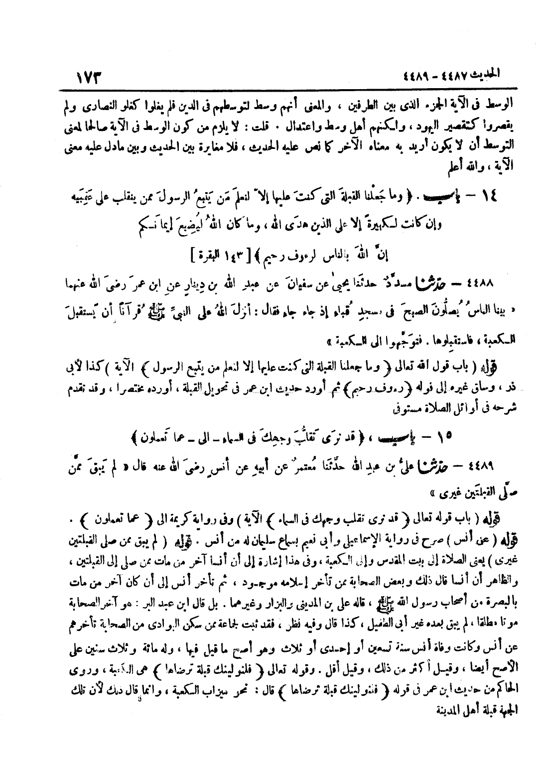 [4489] قَوْلُهُ عَنْ أَنَسٍ صَرَّحَ فِي رِوَايَةِ الْإِسْمَاعِيلِيِّ وَأَبِي نُعَيْمٍ بِسَمَاعِ سُلَيْمَانَ لَهُ مِنْ أَنَسٍ قَوْلُهُ لَمْ يَبْقَ مِمَّنْ صَلَّى الْقِبْلَتَيْنِ غَيْرِي يَعْنِي الصَّلَاةَ إِلَى بَيْتِ الْمَقْدِسِ وَإِلَى الْكَعْبَةِ وَفِي هَذَا إِشَارَةٌ إِلَى أَنَّ أَنَسًا آخِرُ مَنْ مَاتَ مِمَّنْ صَلَّى إِلَى الْقِبْلَتَيْنِ وَالظَّاهِرُ أَنَّ أَنَسًا قَالَ ذَلِكَ وَبَعْضُ الصَّحَابَةِ مِمَّنْ تَأَخَّرَ إِسْلَامُهُ مَوْجُودٌ ثُمَّ تَأَخَّرَ أَنَسٌ إِلَى أَن كَانَ آخر من مَاتَ بِالْبَصْرَةِ مِنْ أَصْحَابِ رَسُولِ اللَّهِ صَلَّى اللَّهُ عَلَيْهِ وَسَلَّمَ قَالَه عَليّ بن الْمَدِينِيّ وَالْبَزَّار وَغَيرهمَا بل قَالَ بن عَبْدِ الْبَرِّ هُوَ آخِرُ الصَّحَابَةِ مَوْتًا مُطْلَقًا لَمْ يَبْقَ بَعْدَهُ غَيْرُ أَبِي الطُّفَيْلِ كَذَا قَالَ وَفِيهِ نَظَرٌ فَقَدْ ثَبَتَ لِجَمَاعَةٍ مِمَّنْ سَكَنَ الْبَوَادِي مِنَ الصَّحَابَةِ تَأَخُّرُهُمْ عَنْ أَنَسٍ وَكَانَتْ وَفَاةُ أَنَسٍ سَنَةَ تِسْعِينَ أَوْ إِحْدَى أَو ثَلَاث وَهُوَ أصح مَا قيل فِيهَا وَلَهُ مِائَةٌ وَثَلَاثُ سِنِينَ عَلَى الْأَصَحِّ أَيْضًا وَقِيلَ أَكْثَرُ مِنْ ذَلِكَ وَقِيلَ أَقَلُّ وَقَوْلُهُ تَعَالَى فلنولينك قبْلَة ترضاها هِيَ الْكَعْبَة وروى الْحَاكِم من حَدِيث بن عمر فِي قَوْله فلنولينك قبْلَة ترضاها قَالَ نَحْوَ مِيزَابِ الْكَعْبَةِ وَإِنَّمَا قَالَ ذَلِكَ لِأَن تِلْكَ الْجِهَة قبْلَة أهل الْمَدِينَة