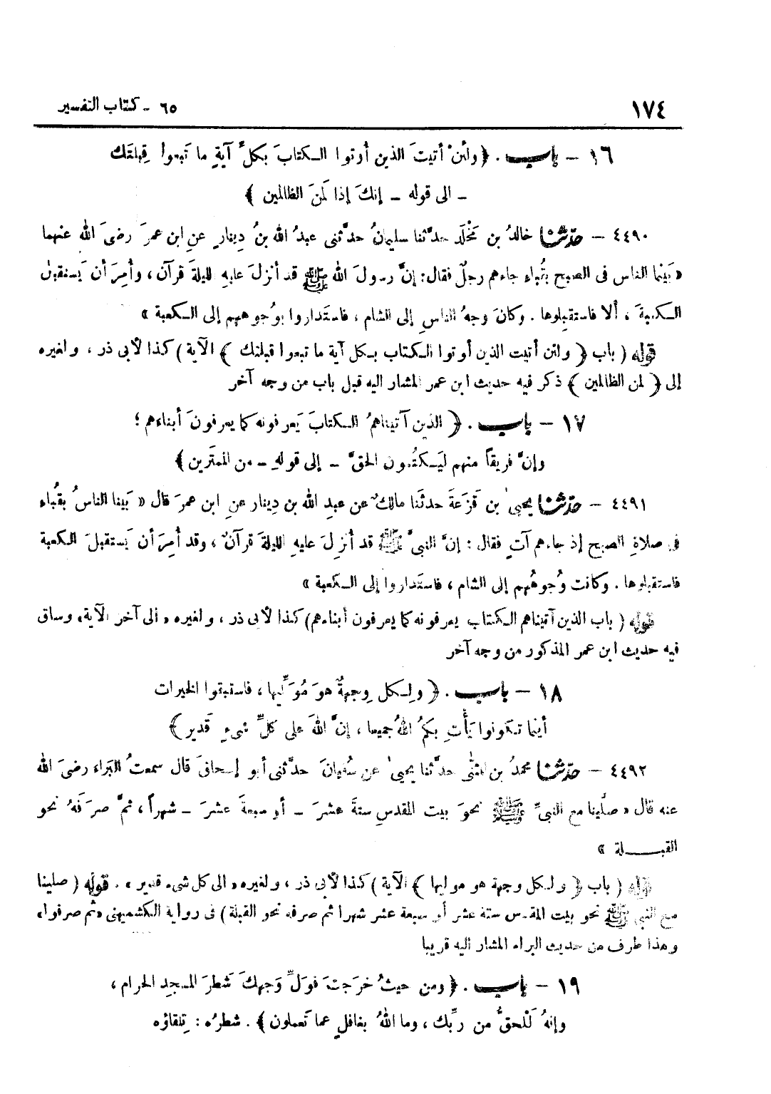 [4492] قَوْلُهُ صَلَّيْنَا مَعَ النَّبِيِّ صَلَّى اللَّهُ عَلَيْهِ وَسَلَّمَ نَحْوَ بَيْتِ الْمَقْدِسِ سِتَّةَ عَشَرَ أَوْ سَبْعَةَ عَشَرَ شَهْرًا ثُمَّ صَرَفَهُ نَحْوَ الْقِبْلَةِ فِي رِوَايَةِ الْكُشْمِيهَنِيِّ ثُمَّ صُرِفُوا وَهَذَا طَرَفٌ مِنْ حَدِيثِ الْبَرَاءِ الْمُشَارِ إِلَيْهِ قَرِيبا