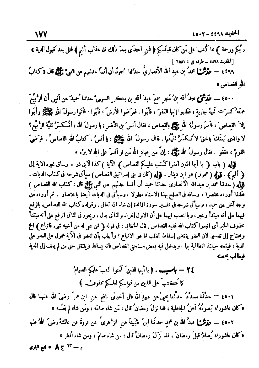 [4499] قَوْلُهُ حَدَّثَنَا مُحَمَّدُ بْنُ عَبْدِ اللَّهِ الْأَنْصَارِيُّ حَدَّثَنَا حُمَيْدٌ أَنَّ أَنَسًا حَدَّثَهُمْ عَنِ النَّبِيِّ صَلَّى اللَّهُ عَلَيْهِ وَسَلَّمَ قَالَ كِتَابُ اللَّهِ الْقِصَاصُ هَكَذَا أَوْرَدَهُ مُخْتَصَرًا وَسَاقَهُ فِي الصُّلْحِ بِهَذَا الْإِسْنَادِ مُطَوَّلًا وَسَيَأْتِي فِي الدِّيَاتِ أَيْضًا بِاخْتِصَارٍ ثُمَّ أَوْرَدَهُ مِنْ وَجْهٍ آخَرَ عَنْ حُمَيْدٍ وَسَيَأْتِي شَرْحُهُ فِي تَفْسِيرِ سُورَةِ الْمَائِدَةِ إِنْ شَاءَ اللَّهُ تَعَالَى وَقَوْلُهُ كِتَابُ اللَّهِ الْقِصَاصُ بِالرَّفْعِ فيهمَا على أَنه مُبْتَدأ وَخبر وَبِالنَّصبِ فِيهِمَا عَلَى أَنَّ الْأَوَّلَ إِغْرَاءٌ وَالثَّانِيَ بَدَلٌ وَيَجُوزُ فِي الثَّانِي الرَّفْعُ عَلَى أَنَّهُ مُبْتَدَأٌ مَحْذُوفُ الْخَبَرِ أَيِ اتَّبِعُوا كِتَابَ اللَّهِ فَفِيهِ الْقِصَاصُ قَالَ الْخَطَّابِيُّ فِي قَوْلِهِ فَمَنْ عُفِيَ لَهُ مِنْ أَخِيهِ شَيْءٌ فاتباع إِلَخْ وَيَحْتَاجُ إِلَى تَفْسِيرٍ لِأَنَّ الْعَفْوَ يَقْتَضِي إِسْقَاطَ الطَّلَبِ فَمَا هُوَ الِاتِّبَاعُ وَأَجَابَ بِأَنَّ الْعَفْوَ فِي الْآيَةِ مَحْمُولٌ عَلَى الْعَفْوِ عَلَى الدِّيَةِ فَيَتَّجِهُ حِينَئِذٍ الْمُطَالَبَةُ بِهَا وَيَدْخُلُ فِيهِ بَعْضُ مُسْتَحَقِّي الْقِصَاصِ فَإِنَّهُ يَسْقُطُ وَيَنْتَقِلُ حَقُّ مَنْ لَمْ يَعْفُ إِلَى الدِّيَةِ فَيُطَالِبُ بِحِصَّتِهِ