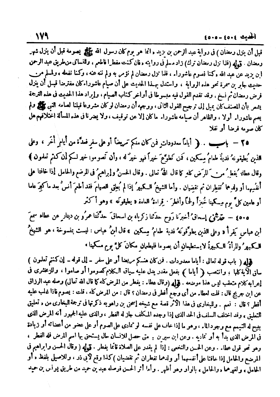 سَاقَ الْآيَةَ كُلَّهَا وَانْتَصَبَ أَيَّامًا بِفِعْلٍ مُقَدَّرٍ يَدُلُّ عَلَيْهِ سِيَاقُ الْكَلَامِ كَصُومُوا أَوْ صَامُوا وَلِلزَّمَخْشَرِيِّ فِي إِعْرَابِهِ كَلَامٌ مُتَعَقَّبٌ لَيْسَ هَذَا مَوْضِعَهُ قَوْلُهُ وَقَالَ عَطَاءٌ يُفْطِرُ مِنَ الْمَرَضِ كُلِّهِ كَمَا قَالَ اللَّهُ تَعَالَى وَصَلَهُ عَبْدُ الرَّزَّاقِ عَنِ بن جُرَيْجٍ قَالَ قُلْتُ لِعَطَاءٍ مِنْ أَيِّ وَجَعٍ أفطر فِي رَمَضَان قَالَ من الْمَرَضِ كُلِّهِ قُلْتُ يَصُومُ فَإِذَا غَلَبَ عَلَيْهِ أَفْطَرَ قَالَ نَعَمْ وَلِلْبُخَارِيِّ فِي هَذَا الْأَثَرِ قِصَّةٌ مَعَ شَيْخِهِ إِسْحَاقَ بْنِ رَاهْوَيْهِ ذَكَرْتُهَا فِي تَرْجَمَةِ الْبُخَارِيِّ مِنْ تَعْلِيقِ التَّعْلِيقِ وَقَدِ اخْتَلَفَ السَّلَفُ فِي الْحَدِّ الَّذِي إِذَا وَجَدَهُ الْمُكَلَّفُ جَازَ لَهُ الْفِطْرُ وَالَّذِي عَلَيْهِ الْجُمْهُورُ أَنَّهُ الْمَرَضُ الَّذِي يُبِيحُ لَهُ التَّيَمُّمَ مَعَ وُجُودِ الْمَاءِ وَهُوَ مَا إِذَا خَافَ عَلَى نَفْسِهِ لَوْ تَمَادَى عَلَى الصَّوْمِ أَوْ عَلَى عُضْوٍ مِنْ أَعْضَائِهِ أَوْ زِيَادَةً فِي الْمَرَضِ الَّذِي بَدَأَ بِهِ أوتماديه وَعَن بن سِيرِينَ مَتَى حَصَلَ لِلْإِنْسَانِ حَالٌ يَسْتَحِقُّ بِهَا اسْمَ الْمَرَضِ فَلَهُ الْفِطْرُ وَهُوَ نَحْوُ قَوْلِ عَطاء وَعَن الْحسن وَالنَّخَعِيّ إِذْ لَمْ يَقْدِرْ عَلَى الصَّلَاةِ قَائِمًا يُفْطِرُ قَوْلُهُ وَقَالَ الْحَسَنُ وَإِبْرَاهِيمُ فِي الْمُرْضِعِ وَالْحَامِلِ إِذَا خَافَتَا عَلَى أَنْفُسِهِمَا أَوْ وَلَدِهِمَا تُفْطِرَانِ ثُمَّ تَقْضِيَانِ كَذَا وَقَعَ لِأَبِي ذَرٍّ وَلِلْأَصِيلِيِّ بِلَفْظِ أَوِ الْحَامِلِ وَلِغَيْرِهِمَا وَالْحَامِلِ بِالْوَاوِ وَهُوَ أَظْهَرُ وَأَمَّا أَثَرُ الْحَسَنِ فَوَصَلَهُ عَبْدُ بْنُ حُمَيْدٍ مِنْ طَرِيقِ يُونُسَ بْنِ حُمَيْدٍ