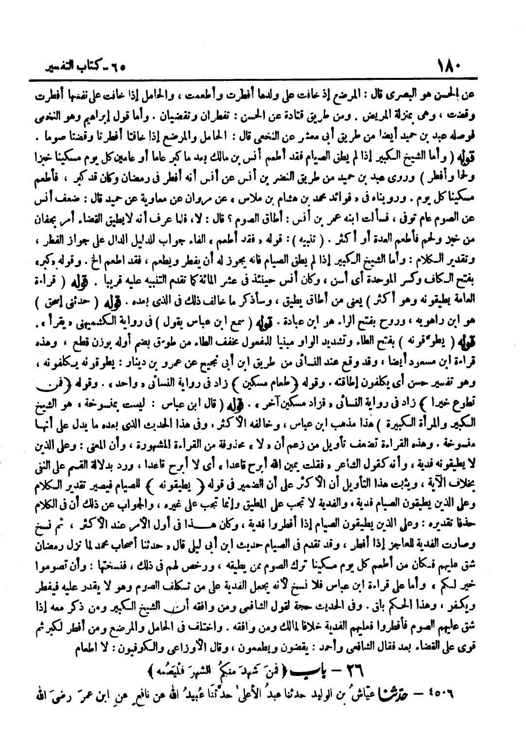 [4505] سمع بن عَبَّاسٍ يَقُولُ فِي رِوَايَةِ الْكُشْمِيهَنِيِّ يَقْرَأُ قَوْلُهُ يُطَوَّقُونَهُ بِفَتْحِ الطَّاءِ وَتَشْدِيدِ الْوَاوِ مَبْنِيًّا لِلْمَفْعُولِ مُخَفَّفُ الطَّاءِ مِنْ طُوِّقَ بِضَمِّ أَوَّلِهِ بِوَزْنِ قطع وَهَذِه قِرَاءَة بن مَسْعُودٍ أَيْضًا وَقَدْ وَقَعَ عِنْدَ النَّسَائِيِّ مِنْ طَرِيق بن أَبِي نَجِيحٍ عَنْ عَمْرِو بْنِ دِينَارٍ يُطَوَّقُونَهُ يُكَلَّفُونَهُ وَهُوَ تَفْسِيرٌ حَسَنٌ أَيْ يُكَلَّفُونَ إِطَاقَتَهُ وَقَوْلُهُ طَعَامُ مِسْكِينٍ زَادَ فِي رِوَايَةِ النَّسَائِيِّ وَاحِد وَقَوله فَمن تطوع خيرا زَادَ فِي رِوَايَةِ النَّسَائِيِّ فَزَادَ مِسْكِينٍ آخَرَ قَوْله قَالَ بن عَبَّاسٍ لَيْسَتْ بِمَنْسُوخَةٍ هُوَ الشَّيْخُ الْكَبِيرُ وَالْمَرْأَةُ الْكَبِيرَة هَذَا مَذْهَب بن عَبَّاسٍ وَخَالَفَهُ الْأَكْثَرُ وَفِي هَذَا الْحَدِيثِ الَّذِي بَعْدَهُ مَا يَدُلُّ عَلَى أَنَّهَا مَنْسُوخَةٌ وَهَذِهِ الْقِرَاءَةُ تُضْعِفُ تَأْوِيلَ مَنْ زَعَمَ أَنَّ لَا مَحْذُوفَةٌ مِنَ الْقِرَاءَةِ الْمَشْهُورَةِ وَأَنَّ الْمَعْنَى وَعَلَى الَّذِينَ لَا يُطِيقُونَهُ فِدْيَةٌ وَأَنَّهُ كَقَوْلِ الشَّاعِرِ فَقُلْتُ يَمِينَ اللَّهِ أَبْرَحُ قَاعِدًا أَيْ لَا أَبْرَحُ قَاعِدًا وَرَدَ بِدَلَالَةِ الْقَسَمِ عَلَى النَّفْيِ بِخِلَافِ الْآيَةِ وَيُثْبِتُ هَذَا التَّأْوِيلَ أَنَّ الْأَكْثَرَ عَلَى أَنَّ الضَّمِيرَ فِي قَوْلِهِ يُطِيقُونَهُ لِلصِّيَامِ فَيَصِيرُ تَقْدِيرُ الْكَلَامِ وَعَلَى الَّذِينَ يُطِيقُونَ الصِّيَامَ فِدْيَةٌ وَالْفِدْيَةُ لَا تَجِبُ عَلَى الْمُطِيقِ وَإِنَّمَا تَجِبُ عَلَى غَيْرِهِ وَالْجَوَابُ عَنْ ذَلِكَ أَنَّ فِي الْكَلَامِ حَذْفًا تَقْدِيرُهُ وَعَلَى الَّذِينَ يُطِيقُونَ الصِّيَامَ إِذَا أَفْطَرُوا فِدْيَةٌ وَكَانَ هَذَا فِي أَوَّلِ الْأَمْرِ عِنْدَ الْأَكْثَرِ ثُمَّ نُسِخَ وَصَارَتِ الْفِدْيَةُ لِلْعَاجِزِ إِذَا أَفْطَرَ وَقَدْ تَقَدَّمَ فِي الصّيام حَدِيث بن أَبِي لَيْلَى قَالَ حَدَّثَنَا أَصْحَابُ مُحَمَّدٍ لَمَّا نَزَلَ رَمَضَانُ شَقَّ عَلَيْهِمْ فَكَانَ مَنْ أَطْعَمَ كُلَّ يَوْمٍ مِسْكِينًا تَرَكَ الصَّوْمَ مِمَّنْ يُطِيقُهُ وَرُخِّصَ لَهُمْ فِي ذَلِكَ فَنَسَخَتْهَا وَأَنْ تَصُومُوا خير لكم وَأما على قِرَاءَة بن عَبَّاسٍ فَلَا نَسْخَ لِأَنَّهُ يَجْعَلُ الْفِدْيَةَ عَلَى مَنْ تَكَلَّفَ الصَّوْمَ وَهُوَ لَا يَقْدِرُ عَلَيْهِ فَيُفْطِرُ وَيُكَفِّرُ وَهَذَا الْحُكْمُ بَاقٍ وَفِي الْحَدِيثِ حُجَّةٌ لِقَوْلِ الشَّافِعِيِّ وَمَنْ وَافَقَهُ أَنَّ الشَّيْخَ الْكَبِيرَ وَمَنْ ذُكِرَ مَعَهُ إِذَا شَقَّ عَلَيْهِمُ الصَّوْمُ فَأَفْطَرُوا فَعَلَيْهِمُ الْفِدْيَةُ خِلَافًا لِمَالِكٍ وَمَنْ وَافَقَهُ وَاخْتُلِفَ فِي الْحَامِلِ وَالْمُرْضِعِ وَمَنْ أَفْطَرَ لِكِبَرٍ ثُمَّ قَوِيَ عَلَى الْقَضَاءِ بَعْدُ فَقَالَ الشَّافِعِيُّ وَأَحْمَدُ يَقْضُونَ وَيُطْعِمُونَ وَقَالَ الْأَوْزَاعِيُّ وَالْكُوفِيُّونَ لَا أطعام