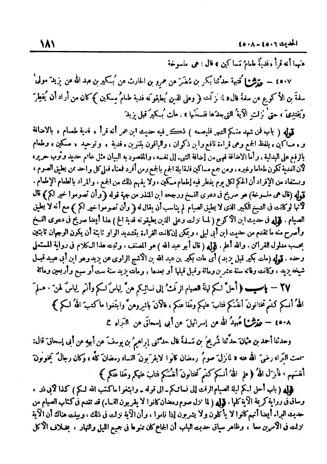 [4507] قَوْلُهُ فِي حَدِيث بن الْأَكْوَعِ لَمَّا نَزَلَتْ وَعَلَى الَّذِينَ يُطِيقُونَهُ فِدْيَةٌ إِلَخْ هَذَا أَيْضًا صَرِيحٌ فِي دَعْوَى النَّسْخِ وأصرح مِنْهُ مَا تقدم من حَدِيث بن أَبِي لَيْلَى وَيُمْكِنُ إِنْ كَانَتِ الْقِرَاءَةُ بِتَشْدِيدِ الْوَاوِ ثَابِتَةً أَنْ يَكُونَ الْوَجْهَانِ ثَابِتَيْنِ بِحَسَبِ مَدْلُولِ الْقَرَائِنِ وَاللَّهُ أَعْلَمُ قَوْلُهُ قَالَ أَبُو عَبْدِ اللَّهِ هُوَ الْمُصَنِّفُ وَثَبَتَ هَذَا الْكَلَامُ فِي رِوَايَةِ الْمُسْتَمْلِي وَحْدَهُ قَوْلُهُ مَاتَ بُكَيْرٌ قَبْلَ يَزِيدَ أَيْ مَاتَ بُكَيْرُ بْنُ عَبْدِ اللَّهِ بْنِ الْأَشَجِّ الرَّاوِي عَنْ يَزِيدَ وَهُوَ بن أَبِي عُبَيْدٍ قَبْلَ شَيْخِهِ يَزِيدَ وَكَانَتْ وَفَاتُهُ سَنَةَ عِشْرِينَ وَمِائَةٍ وَقِيلَ قَبْلَهَا أَوْ بَعْدَهَا وَمَاتَ يَزِيدُ سَنَةَ سِتٍّ أَوْ سَبْعٍ وَأَرْبَعِينَ وَمِائَة
