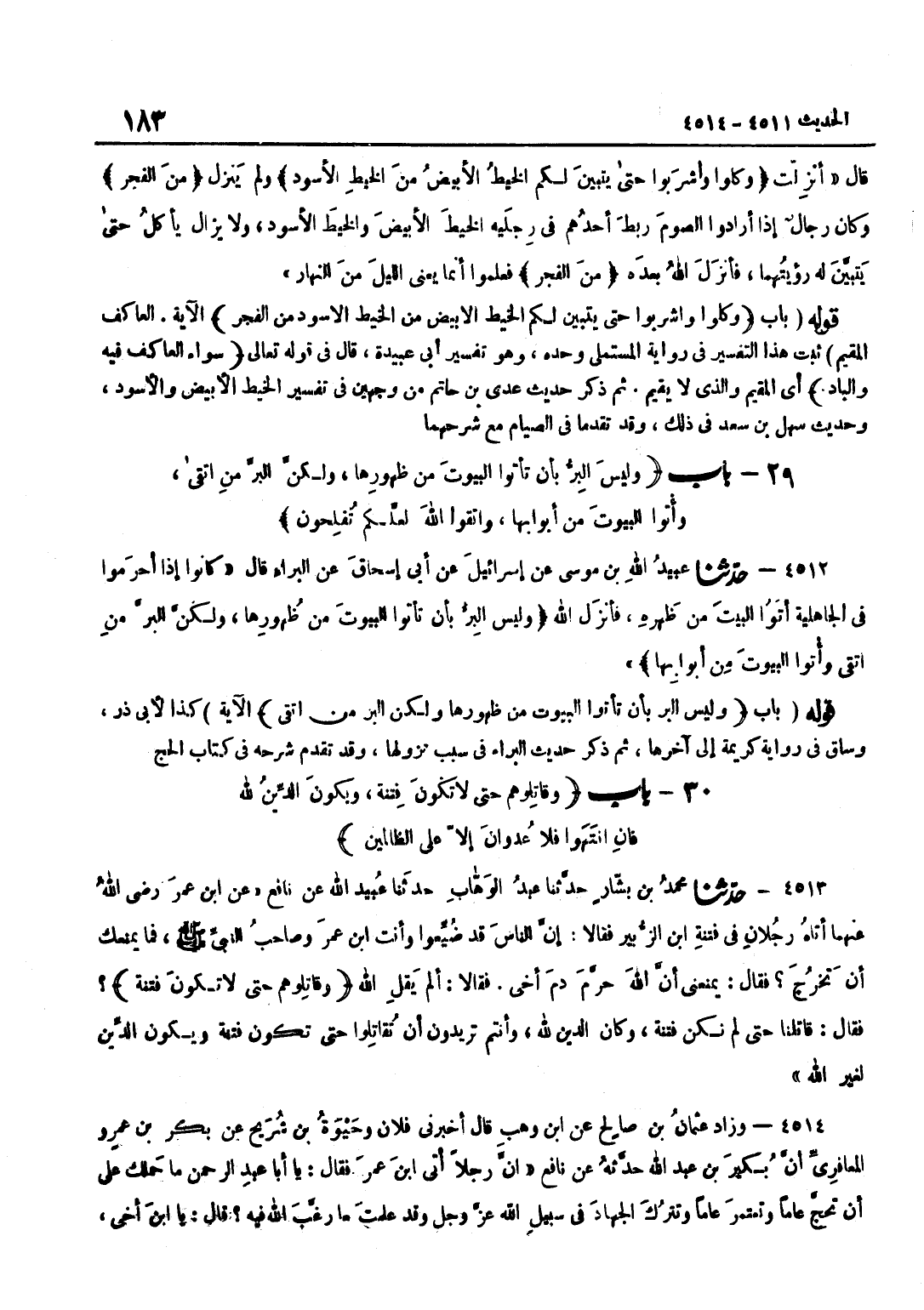 الْعَاكِفُ الْمُقِيمُ ثَبَتَ هَذَا التَّفْسِيرُ فِي رِوَايَةِ الْمُسْتَمْلِي وَحْدَهُ وَهُوَ تَفْسِيرُ أَبِي عُبَيْدَةَ قَالَ فِي قَوْلِهِ تَعَالَى سَوَاءٌ الْعَاكِفُ فِيهِ والباد أَي الْمُقِيم وَالَّذِي لَا يُقيم ثُمَّ ذَكَرَ حَدِيثُ عَدِيِّ بْنِ حَاتِمٍ مِنْ وَجْهَيْنِ فِي تَفْسِيرِ الْخَيْطِ الْأَبْيَضِ وَالْأَسْوَدِ وَحَدِيثِ سَهْلِ بْنِ سَعْدٍ فِي ذَلِكَ وَقَدْ تَقَدَّمَا فِي الصِّيَامِ مَعَ شرحهما قَوْلُهُ بَابُ وَلَيْسَ الْبِرُّ بِأَنْ تَأْتُوا الْبُيُوتَ من ظُهُورهَا وَلَكِن الْبر من اتَّقى الْآيَةَ كَذَا لِأَبِي ذَرٍّ وَسَاقَ فِي رِوَايَةِ كَرِيمَةَ إِلَى آخِرِهَا ثُمَّ ذَكَرَ حَدِيثَ الْبَرَاءِ فِي سَبَب نُزُولهَا وَقد تقدم شَرحه فِي كتاب الْحَج