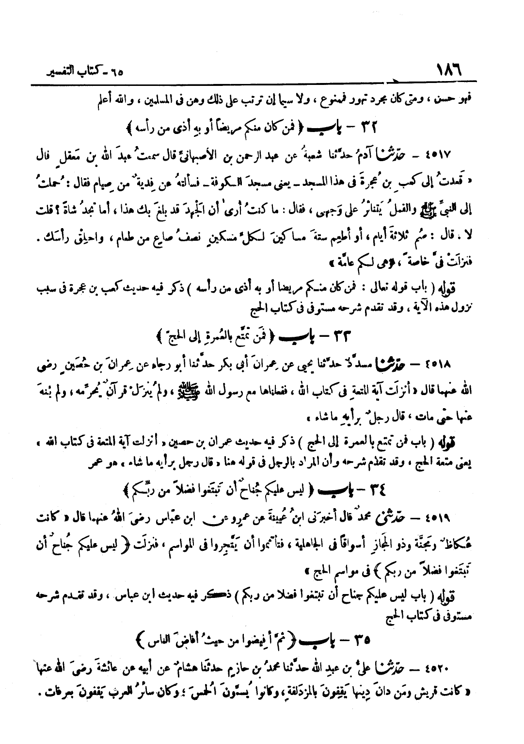ذَكَرَ فِيهِ حَدِيث كَعْب بن عُجْرَةَ فِي سَبَبِ نُزُولِ هَذِهِ الَآيَةِ وَقَدْ تَقَدَّمَ شَرْحُهُ مُسْتَوْفًى فِي كِتَابِ الْحَجِّ قَوْلُهُ بَابُ فَمَنْ تَمَتَّعَ بِالْعُمْرَةِ إِلَى الْحَجِّ ذَكَرَ فِيهِ حَدِيثَ عِمْرَانَ بْنِ حُصَيْنٍ أُنْزِلَتْ آيَةُ الْمُتْعَةِ فِي كِتَابِ اللَّهِ يَعْنِي