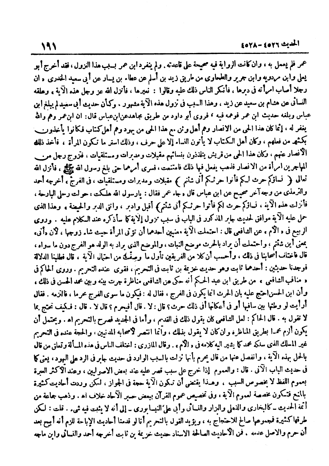 عُمَرَ فَلَمْ يَعْمَلْ بِهِ وَإِنْ كَانَتِ الرِّوَايَةُ فِيهِ صَحِيحَة على قَاعِدَته وَلم ينْفَرد بن عُمَرَ بِسَبَبِ هَذَا النُّزُولِ فَقَدْ أَخْرَجَ أَبُو يعلى وبن مرْدَوَيْه وبن جَرِيرٍ وَالطَّحَاوِيُّ مِنْ طَرِيقِ زَيْدِ بْنِ أَسْلَمَ عَنْ عَطَاءِ بْنِ يَسَارٍ عَنْ أَبِي سَعِيدٍ الْخُدْرِيِّ أَنَّ رَجُلًا أَصَابَ امْرَأَتَهُ فِي دُبُرِهَا فَأَنْكَرَ النَّاسُ ذَلِكَ عَلَيْهِ وَقَالُوا نُعَيِّرُهَا فَأَنْزَلَ اللَّهُ عَزَّ وَجَلَّ هَذِهِ الْآيَةَ وَعَلَّقَهُ النَّسَائِيُّ عَنْ هِشَامِ بْنِ سَعِيدٍ عَنْ زَيْدٍ وَهَذَا السَّبَبُ فِي نُزُولِ هَذِهِ الْآيَةِ مَشْهُورٌ وَكَأَنَّ حَدِيث أبي سعيد لم يبلغ بن عَبَّاس وبلغه حَدِيث بن عُمَرَ فَوَهَّمَهُ فِيهِ فَرَوَى أَبُو دَاوُدَ مِنْ طَرِيق مُجَاهِد عَن بن عَبَّاس قَالَ أَن بن عُمَرَ وَهِمَ وَاللَّهُ يَغْفِرُ لَهُ إِنَّمَا كَانَ هَذَا الْحَيُّ مِنَ الْأَنْصَارِ وَهُمْ أَهْلُ وَثَنٍ مَعَ هَذَا الْحَيِّ مِنْ يَهُودَ وَهُمْ أَهْلُ كِتَابٍ فَكَانُوا يَأْخُذُونَ بِكَثِيرٍ مِنْ فِعْلِهِمْ وَكَانَ أَهْلُ الْكِتَابِ لَا يَأْتُونَ النِّسَاءَ إِلَّا عَلَى حَرْفٍ وَذَلِكَ أَسْتُرُ مَا تَكُونُ الْمَرْأَةُ فَأَخَذَ ذَلِكَ الْأَنْصَارُ عَنْهُمْ وَكَانَ هَذَا الْحَيُّ مِنْ قُرَيْشٍ يَتَلَذَّذُونَ بِنِسَائِهِمْ مُقْبِلَاتٍ وَمُدْبِرَاتٍ وَمُسْتَلْقِيَاتٍ فَتَزَوَّجَ رَجُلٌ مِنَ الْمُهَاجِرِينَ امْرَأَةً مِنَ الْأَنْصَارِ فَذَهَبَ يَفْعَلُ فِيهَا ذَلِكَ فَامْتَنَعَتْ فَسَرَى أَمْرُهُمَا حَتَّى بَلَغَ رَسُولُ اللَّهِ صَلَّى اللَّهُ عَلَيْهِ وَسَلَّمَ فَأَنْزَلَ اللَّهُ تَعَالَى نِسَاؤُكُمْ حَرْثٌ لَكُمْ فَأْتُوا حَرْثكُمْ أَنى شِئْتُم مُقْبِلَاتٍ وَمُدْبِرَاتٍ وَمُسْتَلْقِيَاتٍ فِي الْفَرْجِ أَخْرَجَهُ أَحْمَدُ وَالتِّرْمِذِيّ من وَجه آخر صَحِيح عَن بن عَبَّاسٍ قَالَ جَاءَ عُمَرُ فَقَالَ يَا رَسُولَ اللَّهِ هَلَكْتُ حَوَّلْتُ رَحْلِي الْبَارِحَةَ فَأُنْزِلَتْ هَذِهِ الْآيَةُ نِسَاؤُكُمْ حَرْثٌ لَكُمْ فَأْتُوا حَرْثَكُمْ أَنَّى شِئْتُم أَقْبِلْ وَأَدْبِرْ وَاتَّقِ الدُّبُرَ وَالْحَيْضَةَ وَهَذَا الَّذِي حُمِلَ عَلَيْهِ الْآيَةُ مُوَافِقٌ لِحَدِيثِ جَابِرٍ الْمَذْكُورِ فِي الْبَابِ فِي سَبَبِ نُزُولِ الْآيَةِ كَمَا سأذكره عِنْدَ الْكَلَامِ عَلَيْهِ وَرَوَى الرَّبِيعُ فِي الْأُمِّ عَنِ الشَّافِعِيِّ قَالَ احْتَمَلَتِ الْآيَةُ مَعْنَيَيْنِ أَحَدُهُمَا أَنْ تُؤْتَى الْمَرْأَةُ حَيْثُ شَاءَ زَوْجُهَا لِأَنَّ أَنَّى بِمَعْنَى أَيْنَ شِئْتُمْ وَاحْتَمَلَتْ أَنْ يُرَادَ بِالْحَرْثِ مَوْضِعُ النَّبَاتِ وَالْمَوْضِعُ الَّذِي يُرَادُ بِهِ الْوَلَدُ هُوَ الْفَرْجُ دُونَ مَا سِوَاهُ قَالَ فَاخْتَلَفَ أَصْحَابُنَا فِي ذَلِكَ وَأَحْسَبُ أَنَّ كُلًّا مِنَ الْفَرِيقَيْنِ تَأَوَّلَ مَا وَصَفْتُ مِنِ احْتِمَالِ الْآيَةِ قَالَ فَطَلَبْنَا الدَّلَالَةَ فَوَجَدْنَا حَدِيثَيْنِ أَحَدُهُمَا ثَابِتٌ وَهُوَ حَدِيثُ خُزَيْمَةَ بْنِ ثَابِتٍ فِي التَّحْرِيمِ فَقَوَّى عِنْدَهُ التَّحْرِيمَ وَرَوَى الْحَاكِمُ فِي مَنَاقِب الشَّافِعِي من طَرِيق بن عَبْدِ الْحَكَمِ أَنَّهُ حَكَى عَنِ الشَّافِعِيِّ مُنَاظَرَةً جرت بَينه وَبَين مُحَمَّد الْحسن فِي ذَلِك وَأَن بن الْحَسَنِ احْتَجَّ عَلَيْهِ بِأَنَّ الْحَرْثَ إِنَّمَا يَكُونُ فِي الْفَرْجِ فَقَالَ لَهُ فَيَكُونُ مَا سِوَى الْفَرْجِ مُحَرَّمًا فَالْتَزَمَهُ فَقَالَ أَرَأَيْتَ لَوْ وَطِئَهَا بَين سافيها أَوْ فِي أَعْكَانِهَا أَفِي ذَلِكَ حَرْثٌ قَالَ لَا قَالَ أَفَيَحْرُمُ قَالَ لَا قَالَ فَكَيْفَ تَحْتَجُّ بِمَا لَا تَقُولُ بِهِ قَالَ الْحَاكِمُ لَعَلَّ الشَّافِعِيَّ كَانَ يَقُولُ ذَلِكَ فِي الْقَدِيمِ