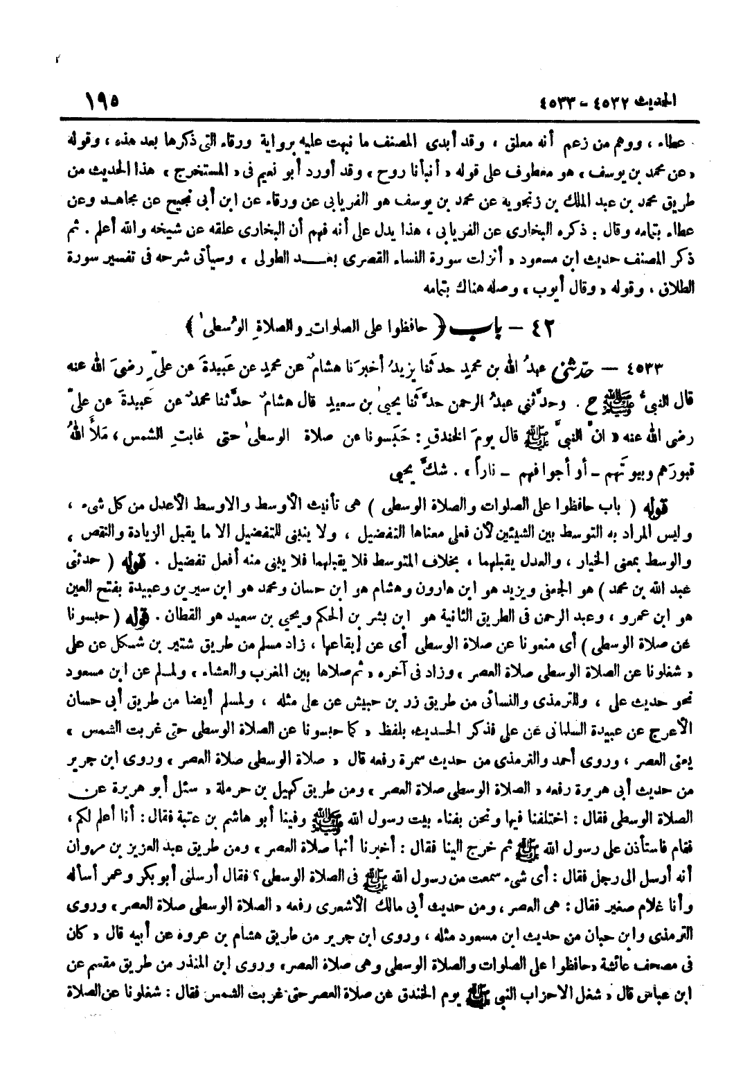 [4533] قَوْلُهُ حَدَّثَنِي عَبْدُ اللَّهِ بْنُ مُحَمَّدٍ هُوَ الْجُعْفِيُّ وَيَزِيدُ هُوَ بن هَارُون وَهِشَام هُوَ بن حسان وَمُحَمّد هُوَ بن سِيرِين وَعبيدَة بِفَتْح الْعين هُوَ بن عَمْرٍو وَعَبْدُ الرَّحْمَنِ فِي الطَّرِيقِ الثَّانِيَةِ هُوَ بن بِشْرِ بْنِ الْحَكَمِ وَيَحْيَى بْنُ سَعِيدٍ هُوَ الْقَطَّانُ قَوْلُهُ حَبَسُونَا عَنْ صَلَاةِ الْوُسْطَى أَيْ مَنَعُونَا عَنِ الصَّلَاةِ الْوُسْطَى أَيْ عَنْ إِيقَاعِهَا زَادَ مُسْلِمٌ مِنْ طَرِيقِ شُتَيْرِ بْنِ شَكَلٍ عَنْ عَلِيٍّ شَغَلُونَا عَنِ الصَّلَاةِ الْوُسْطَى صَلَاةِ الْعَصْرِ وَزَادَ فِي آخِرِهِ ثُمَّ صَلَّاهَا بَيْنَ الْمغرب وَالْعشَاء وَلمُسلم عَن بن مَسْعُودٍ نَحْوُ حَدِيثِ عَلِيٍّ وَلِلتِّرْمِذِيِّ وَالنَّسَائِيِّ مِنْ طَرِيقِ زِرِّ بْنِ حُبَيْشٍ عَنْ عَلِيٍّ مِثْلُهُ وَلِمُسْلِمٍ أَيْضًا مِنْ طَرِيقِ أَبِي حَسَّانَ الْأَعْرَجِ عَنْ عَبِيدَةَ السَّلْمَانِيِّ عَنْ عَلِيٍّ فَذَكَرَ الْحَدِيثَ بِلَفْظِ كَمَا حَبَسُونَا عَنِ الصَّلَاةِ الْوُسْطَى حَتَّى غَرَبَتِ الشَّمْسُ يَعْنِي الْعَصْرَ وَرَوَى أَحْمَدُ وَالتِّرْمِذِيُّ مِنْ حَدِيثِ سَمُرَةَ رَفَعَهُ قَالَ صَلَاةُ الْوُسْطَى صَلَاة الْعَصْر وروى بن جَرِيرٍ مِنْ حَدِيثِ أَبِي هُرَيْرَةَ رَفَعَهُ الصَّلَاةُ الْوُسْطَى صَلَاةُ الْعَصْرِ وَمِنْ طَرِيقِ كُهَيْلِ بْنِ حَرْمَلَةَ سُئِلَ أَبُو هُرَيْرَةَ عَنِ الصَّلَاةِ الْوُسْطَى فَقَالَ اخْتَلَفْنَا فِيهَا وَنَحْنُ بِفِنَاءِ بَيْتِ رَسُولِ اللَّهِ صَلَّى اللَّهُ عَلَيْهِ وَسَلَّمَ وَفِينَا أَبُو هَاشِمِ بْنِ عُتْبَةَ فَقَالَ أَنَا أَعْلَمُ لَكُمْ فَقَامَ فَاسْتَأْذَنَ عَلَى رَسُولِ اللَّهِ صَلَّى اللَّهُ عَلَيْهِ وَسَلَّمَ ثُمَّ خَرَجَ إِلَيْنَا فَقَالَ أَخْبَرَنَا أَنَّهَا صَلَاةُ الْعَصْرِ وَمِنْ طَرِيقِ عَبْدِ الْعَزِيزِ بْنِ مَرْوَانَ أَنَّهُ أَرْسَلَ إِلَى رَجُلٍ فَقَالَ أَيُّ شَيْءٍ سَمِعْتُ مِنْ رَسُولِ اللَّهِ صَلَّى اللَّهُ عَلَيْهِ وَسَلَّمَ فِي الصَّلَاةِ الْوُسْطَى فَقَالَ أَرْسَلَنِي أَبُو بَكْرٍ وَعُمَرُ أَسْأَلُهُ وَأَنَا غُلَامٌ صَغِيرٌ فَقَالَ هِيَ الْعَصْرُ وَمِنْ حَدِيثِ أَبِي مَالِكٍ الْأَشْعَرِيِّ رَفَعَهُ الصَّلَاةُ الْوُسْطَى صَلَاةُ الْعَصْرِ وروى التِّرْمِذِيّ وبن حبَان من حَدِيث بن مَسْعُود مثله وروى بن جَرِيرٍ مِنْ طَرِيقِ هِشَامِ بْنِ عُرْوَةَ عَنْ أَبِيهِ قَالَ كَانَ فِي مُصْحَفِ عَائِشَةَ حَافِظُوا عَلَى الصَّلَوَاتِ وَالصَّلَاةِ الْوُسْطَى وَهِيَ صَلَاةُ الْعَصْرِ وروى بن الْمُنْذر من طَرِيق مقسم عَن بن عَبَّاسٍ قَالَ شَغَلَ الْأَحْزَابُ النَّبِيِّ صَلَّى اللَّهُ عَلَيْهِ وَسَلَّمَ يَوْمَ الْخَنْدَقِ عَنْ صَلَاةِ الْعَصْرِ حَتَّى غَرَبَتِ الشَّمْسُ فَقَالَ شَغَلُونَا عَنِ الصَّلَاةِ