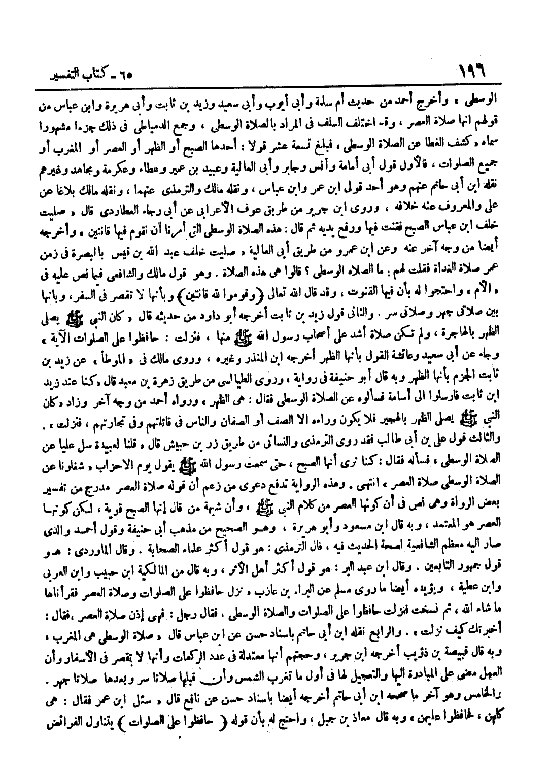الْوُسْطَى وَأَخْرَجَ أَحْمَدُ مِنْ حَدِيثِ أُمِّ سَلَمَةَ وَأَبِي أَيُّوبَ وَأَبِي سَعِيدٍ وَزَيْدِ بْنِ ثَابِتٍ وَأبي هُرَيْرَة وبن عَبَّاسٍ مِنْ قَوْلِهِمْ إِنَّهَا صَلَاةُ الْعَصْرِ وَقَدِ اخْتَلَفَ السَّلَفُ فِي الْمُرَادِ بِالصَّلَاةِ الْوُسْطَى وَجَمَعَ الدِّمْيَاطِيُّ فِي ذَلِكَ جُزْءًا مَشْهُورًا سَمَّاهُ كَشْفُ الْغِطَا عَنِ الصَّلَاةِ الْوُسْطَى فَبَلَغَ تِسْعَةَ عَشَرَ قَوْلًا أَحَدُهَا الصُّبْحُ أَوِ الظُّهْرُ أَوِ الْعَصْرُ أَوِ الْمَغْرِبُ أَوْ جَمِيعُ الصَّلَوَاتِ فَالْأَوَّلُ قَوْلُ أَبِي أُمَامَةَ وَأَنَسٍ وَجَابِرٍ وَأَبِي الْعَالِيَةِ وَعُبَيْدِ بْنِ عُمَيْرٍ وَعَطَاءٍ وَعِكْرِمَةَ وَمُجَاهِدٍ وَغَيْرِهِمْ نَقَلَهُ بن أبي حَاتِم عَنْهُم وَهُوَ أحد قولي بن عمر وبن عَبَّاسٍ وَنَقَلَهُ مَالِكٌ وَالتِّرْمِذِيُّ عَنْهُمَا وَنَقَلَهُ مَالِكٌ بَلَاغًا عَنْ عَلِيٍّ وَالْمَعْرُوفُ عَنْهُ خِلَافُهُ وَرَوَى بن جَرِيرٍ مِنْ طَرِيقِ عَوْفٍ الْأَعْرَابِيِّ عَنْ أَبِي رَجَاء العطاردي قَالَ صليت خلف بن عَبَّاسٍ الصُّبْحَ فَقَنَتَ فِيهَا وَرَفَعَ يَدَيْهِ ثُمَّ قَالَ هَذِهِ الصَّلَاةُ الْوُسْطَى الَّتِي أُمِرْنَا أَنْ نَقُومَ فِيهَا قَانِتِينَ وَأَخْرَجَهُ أَيْضًا مِنْ وَجْهٍ آخر عَنهُ وَعَن بن عَمْرٍو مِنْ طَرِيقِ أَبِي الْعَالِيَةِ صَلَّيْتُ خَلْفَ عَبْدِ اللَّهِ بْنِ قَيْسٍ بِالْبَصْرَةِ فِي زَمَنِ عُمَرَ صَلَاةَ الْغَدَاةِ فَقُلْتُ لَهُمْ مَا الصَّلَاةُ الْوُسْطَى قَالُوا هِيَ هَذِهِ الصَّلَاةُ وَهُوَ قَوْلُ مَالِكٍ وَالشَّافِعِيِّ فِيمَا نَصَّ عَلَيْهِ فِي الْأُمِّ وَاحْتَجُّوا لَهُ بِأَنَّ فِيهَا الْقُنُوتَ وَقَدْ قَالَ اللَّهُ تَعَالَى وَقومُوا لله قَانِتِينَ وبأنها لاتقصر فِي السَّفَرِ وَبِأَنَّهَا بَيْنَ صَلَاتَيْ جَهْرٍ وَصَلَاتَيْ سِرٍّ وَالثَّانِي قَوْلُ زَيْدِ بْنِ ثَابِتٍ أَخْرَجَهُ أَبُو دَاوُدَ مِنْ حَدِيثِهِ قَالَ كَانَ النَّبِيُّ صَلَّى اللَّهُ عَلَيْهِ وَسَلَّمَ يُصَلِّي الظُّهْرَ بِالْهَاجِرَةِ وَلَمْ تَكُنْ صَلَاةٌ أَشَدَّ عَلَى أَصْحَابِ رَسُولِ اللَّهِ صَلَّى اللَّهُ عَلَيْهِ وَسَلَّمَ مِنْهَا فَنَزَلَتْ حَافِظُوا عَلَى الصَّلَوَاتِ الْآيَةَ وَجَاءَ عَنْ أَبِي سعيد وَعَائِشَة القَوْل بِأَنَّهَا الظّهْر أخرجه بن الْمُنْذِرِ وَغَيْرُهُ وَرَوَى مَالِكٌ فِي الْمُوَطَّأِ عَنْ زَيْدِ بْنِ ثَابِتٍ الْجَزْمُ بِأَنَّهَا الظُّهْرُ وَبِهِ قَالَ أَبُو حَنِيفَةَ فِي رِوَايَةٍ وَرَوَى الطَّيَالِسِيُّ مِنْ طَرِيقِ زُهْرَةَ بْنِ مَعْبَدٍ قَالَ كُنَّا عِنْدَ زَيْدِ بْنِ ثَابِتٍ فَأَرْسَلُوا إِلَى أُسَامَةَ فَسَأَلُوهُ عَنِ الصَّلَاةِ الْوُسْطَى فَقَالَ هِيَ الظُّهْرُ وَرَوَاهُ أَحْمَدُ مِنْ وَجْهٍ آخَرَ وَزَادَ كَانَ النَّبِيُّ صَلَّى اللَّهُ عَلَيْهِ وَسَلَّمَ يُصَلِّي الظُّهْرَ بِالْهَجِيرِ فَلَا يَكُونُ وَرَاءَهُ إِلَّا الصَّفُّ أَوِ الصَّفَّانِ وَالنَّاسُ فِي قَائِلَتِهِمْ وَفِي تِجَارَتِهِمْ فَنَزَلَتْ وَالثَّالِثُ قَوْلُ عَلِيِّ بْنِ أَبِي طَالِبٍ فَقَدْ رَوَى التِّرْمِذِيُّ وَالنَّسَائِيُّ مِنْ طَرِيقِ زِرِّ بْنِ حُبَيْشٍ قَالَ قُلْنَا لِعَبِيدَةَ سَلْ عَلِيًّا عَنِ الصَّلَاةِ الْوُسْطَى فَسَأَلَهُ فَقَالَ كُنَّا نَرَى أَنَّهَا الصُّبْحُ حَتَّى سَمِعْتُ رَسُولَ اللَّهِ صَلَّى اللَّهُ عَلَيْهِ وَسَلَّمَ يَقُولُ يَوْمَ الْأَحْزَابِ شَغَلُونَا عَنِ الصَّلَاةِ الْوُسْطَى صَلَاةِ الْعَصْرِ انْتَهَى وَهَذِهِ الرِّوَايَةُ تَدْفَعُ دَعْوَى مَنْ زَعَمَ أَنَّ قَوْلَهُ صَلَاةُ الْعَصْرِ مُدْرَجٌ مِنْ تَفْسِيرِ بَعْضِ الرُّوَاةِ وَهِيَ نَصٌّ فِي أَنَّ كَوْنَهَا الْعَصْرَ مِنْ كَلَامِ النَّبِيِّ صَلَّى اللَّهُ عَلَيْهِ وَسَلَّمَ وَأ