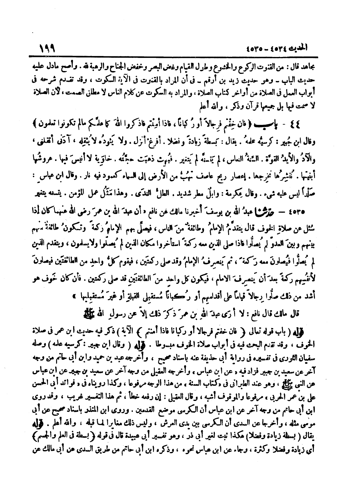 ذكر فِيهِ حَدِيث بن عُمَرَ فِي صَلَاةِ الْخَوْفِ وَقَدْ تَقَدَّمَ الْبَحْثُ فِيهِ فِي أَبْوَابِ صَلَاةِ الْخَوْفِ مَبْسُوطًا قَوْلُهُ وَقَالَ بن جُبَيْرٍ كُرْسِيِّهِ عِلْمِهِ وَصَلَهُ سُفْيَانُ الثَّوْرِيِّ فِي تَفْسِيرِهِ فِي رِوَايَةِ أَبِي حُذَيْفَةَ عَنْهُ بِإِسْنَادٍ صَحِيح وَأخرجه عبد بن حميد وبن أَبِي حَاتِمٍ مِنْ وَجْهٍ آخَرَ عَنْ سَعِيدِ بْنِ جُبَيْرٍ فَزَاد فِيهِ عَن بن عَبَّاسٍ وَأَخْرَجَهُ الْعُقَيْلِيُّ مِنْ وَجْهٍ آخَرَ عَنْ سَعِيدِ بْنِ جُبَيْرٍ عَن بن عَبَّاسٍ عَنِ النَّبِيِّ صَلَّى اللَّهُ عَلَيْهِ وَسَلَّمَ وَهُوَ عِنْدَ الطَّبَرَانِيِّ فِي كِتَابِ السُّنَّةِ مِنْ هَذَا الْوَجْهِ مَرْفُوعًا وَكَذَا رُوِّينَاهُ فِي فَوَائِدِ أَبِي الْحَسَنِ عَلِيِّ بْنِ عُمَرَ الْحَرْبِيِّ مَرْفُوعًا وَالْمَوْقُوفُ أَشْبَهَ وَقَالَ الْعُقَيْلِيُّ إِنَّ رَفْعَهُ خَطَأٌ ثمَّ هَذَا التَّفْسِير غَرِيب وَقد روى بن أبي حَاتِم من وَجه آخر عَن بن عَبَّاس أَن الْكُرْسِيّ مَوضِع الْقَدَمَيْنِ وروى بن الْمُنْذِرِ بِإِسْنَادٍ صَحِيحٍ عَنْ أَبِي مُوسَى مِثْلِهِ وَأَخْرَجَا عَنِ السُّدِّيِّ أَنَّ الْكُرْسِيَّ بَيْنَ يَدَيِ الْعَرْشِ وَلَيْسَ ذَلِكَ مُغَايِرًا لِمَا قَبْلَهُ وَاللَّهُ أَعْلَمُ قَوْلُهُ يُقَالُ بَسْطَةُ زِيَادَةٍ وَفَضْلًا هَكَذَا ثَبَتَ لِغَيْرِ أَبِي ذَرٍّ وَهُوَ تَفْسِيرُ أَبِي عُبَيْدَةَ قَالَ فِي قَوْلِهِ بَسْطَةً فِي الْعِلْمِ والجسم أَي زِيَادَة وفضلا وَكَثْرَة وَجَاء عَن بن عَبَّاس نَحوه وَذكره بن أَبِي حَاتِمٍ مِنْ طَرِيقِ السُّدِّيِّ عَنْ أَبِي مَالِكٍ عَنِ