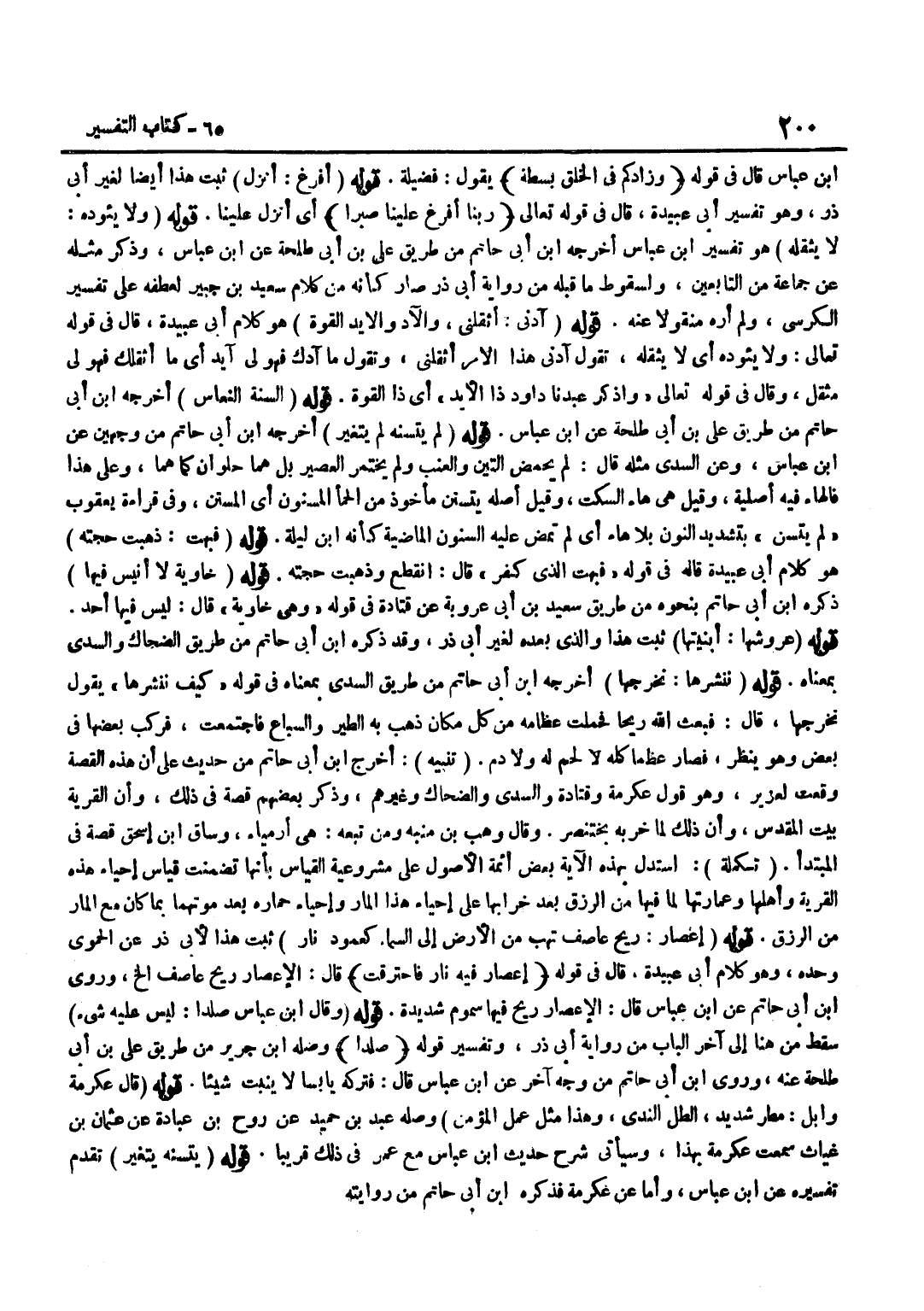 بن عَبَّاسٍ قَالَ فِي قَوْلِهِ وَزَادَكُمْ فِي الْخَلْقِ بسطة يَقُولُ فَضِيلَةً قَوْلُهُ أَفْرِغْ أَنْزِلْ ثَبَتَ هَذَا أَيْضًا لِغَيْرِ أَبِي ذَرٍّ وَهُوَ تَفْسِيرُ أَبِي عُبَيْدَةَ قَالَ فِي قَوْلِهِ تَعَالَى رَبَّنَا أَفْرِغْ علينا صبرا أَيْ أَنْزِلْ عَلَيْنَا قَوْلُهُ وَلَا يَئُودُهُ لَا يثقله هُوَ تَفْسِير بن عَبَّاس أخرجه بن أَبِي حَاتِمٍ مِنْ طَرِيقِ عَلِيِّ بْنِ أَبِي طَلْحَةَ عَنِ بن عَبَّاسٍ وَذُكِرَ مِثْلُهُ عَنْ جَمَاعَةٍ مِنَ التَّابِعِينَ وَلِسُقُوطِ مَا قَبْلَهُ مِنْ رِوَايَةِ أَبِي ذَرٍّ صَارَ كَأَنَّهُ مِنْ كَلَامِ سَعِيدِ بْنِ جُبَيْرٍ لِعَطْفِهِ عَلَى تَفْسِيرِ الْكُرْسِيِّ وَلَمْ أَرَهُ مَنْقُولًا عَنْهُ قَوْلُهُ آدَنِي أَثْقَلَنِي وَالْآدُ وَالْأَيْدُ الْقُوَّةُ هُوَ كَلَامِ أَبِي عُبَيْدَةَ قَالَ فِي قَوْلِهِ تَعَالَى وَلَا يَئُودُهُ أَيْ لَا يُثْقِلُهُ تَقُولُ آدَنِي هَذَا الْأَمْرُ أَثْقَلَنِي وَتَقُولُ مَا آدَكَ فَهُوَ لِي آيِدٌ أَيْ مَا أَثْقَلَكَ فَهُوَ لِي مُثْقِلٌ وَقَالَ فِي قَوْلِهِ تَعَالَى وَاذْكُرْ عَبدنَا دَاوُد ذَا الايد أَيْ ذَا الْقُوَّةِ قَوْلُهُ السِّنَةُ النُّعَاسُ أَخْرَجَهُ بن أَبِي حَاتِمٍ مِنْ طَرِيقِ عَلِيِّ بْنِ أَبِي طَلْحَةَ عَنِ بن عَبَّاسٍ قَوْلُهُ لَمْ يَتَسَنَّهْ لَمْ يَتَغَيَّرْ أَخْرَجَهُ بن أبي حَاتِم من وَجْهَيْن عَن بن عَبَّاسٍ وَعَنِ السُّدِّيِّ مِثْلُهُ قَالَ لَمْ يَحْمُضِ التِّينُ وَالْعِنَبُ وَلَمْ يَخْتَمِرِ الْعَصِيرُ بَلْ هُمَا حُلْو أَن كَمَا هُمَا وَعَلَى هَذَا فَالْهَاءُ فِيهِ أَصْلِيَّةٌ وَقِيلَ هِيَ هَاءُ السَّكْتِ وَقِيلَ أَصْلُهُ يَتَسَنَّنُ مَأْخُوذٌ مِنَ الْحَمَأِ الْمَسْنُونِ أَيِ الْمُسْتَنِّ وَفِي قِرَاءَةِ يَعْقُوبَ لَمْ يَتَسَنَّ بِتَشْدِيدِ النُّونِ بِلَا هَاءٍ أَيْ لَمْ تَمْضِ عَلَيْهِ السُّنُونَ الْمَاضِيَةُ كَأَنَّهُ بن لَيْلَةٍ قَوْلُهُ فَبُهِتَ ذَهَبَتْ حُجَّتُهُ هُوَ كَلَامُ أَبِي عُبَيْدَةَ قَالَهُ فِي قَوْلِهِ فَبُهِتَ الَّذِي كَفَرَ قَالَ انْقَطَعَ وَذَهَبَتْ حُجَّتُهُ قَوْلُهُ خَاوِيَةٌ لَا أنيس فِيهَا ذكره بن أَبِي حَاتِمٍ بِنَحْوِهِ مِنْ طَرِيقِ سَعِيدِ بْنِ أَبِي عَرُوبَةَ عَنْ قَتَادَةَ فِي قَوْلِهِ وَهِيَ خَاوِيَةٌ قَالَ لَيْسَ فِيهَا أَحَدٌ قَوْلُهُ عُرُوشِهَا أَبْنِيَتِهَا ثَبَتَ هَذَا وَالَّذِي بَعْدَهُ لِغَيْرِ أَبِي ذَر وَقد ذكره بن أَبِي حَاتِمٍ مِنْ طَرِيقِ الضَّحَّاكِ وَالسُّدِّيِّ بِمَعْنَاهُ قَوْله ننشرها نخرجها أخرجه بن أَبِي حَاتِمٍ مِنْ طَرِيقِ السُّدِّيِّ بِمَعْنَاهُ فِي قَوْله كَيفَ ننشرها يَقُولُ نُخْرِجُهَا قَالَ فَبَعَثَ اللَّهُ رِيحًا فَحَمَلَتْ عِظَامَهُ مِنْ كُلِّ مَكَانٍ ذَهَبَ بِهِ الطَّيْرُ وَالسِّبَاعُ فَاجْتَمَعَتْ فَرُكِّبَ بَعْضُهَا فِي بَعْضٍ وَهُوَ يَنْظُرُ فَصَارَ عَظْمًا كُلَّهُ لَا لَحْمَ لَهُ وَلَا دم تَنْبِيه أخرج بن أَبِي حَاتِمٍ مِنْ حَدِيثِ عَلِيٍّ أَنَّ هَذِهِ الْقِصَّة وَقعت لعزيز وَهُوَ قَوْلُ عِكْرِمَةَ وَقَتَادَةَ وَالسُّدِّيِّ وَالضَّحَّاكِ وَغَيْرِهِمْ وَذَكَرَ بَعْضُهُمْ قِصَّةً فِي ذَلِكَ وَأَنَّ الْقَرْيَةَ بَيت الْمُقَدّس وَأَنَّ ذَلِكَ لَمَّا خَرَّبَهُ بُخْتَنَصَّرَ وَقَالَ وَهْبُ بْنُ مُنَبِّهٍ وَمَنْ تَبِعَهُ هِيَ أَرْمِيَاءُ وَسَاقَ بن إِسْحَاقَ قِصَّةً فِي الْمُبْتَدَأِ تَكْمِلَةٌ اسْتَدَلَّ بِهَذِهِ الْآيَةِ بَعْضُ أَئِمَّةِ الْأُصُولِ عَلَى مَشْرُوعِيَّةِ الْقِيَاسِ بِأَنَّهَا تَضَمَّنَتْ قِيَاسَ إِحْيَاءِ هَذِهِ الْقَرْيَةِ وَأَهْلِهَا وَعِمَارَتِهَا لِمَا فِيهَا مِنَ الرِّزْقِ بَعْدَ خَرَابِهَا عَلَى إِحْيَاءِ هَذَا الْمَارِّ وَإِحْيَاءِ حِمَارِهِ بَعْدَ مَوْتِهِمَا بِمَا كَانَ مَعَ الْمَارِّ مِن