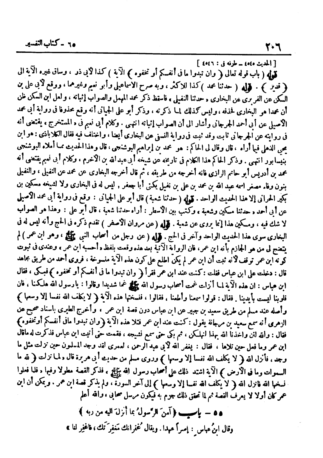 [4545] قَوْلُهُ حَدَّثَنَا مُحَمَّدٌ كَذَا لِلْأَكْثَرِ وَبِهِ صَرَّحَ الْإِسْمَاعِيلِيُّ وَأَبُو نُعَيْمٍ وَغَيْرُهُمَا وَوَقَعَ لِأَبِي عَلِيِّ بْنِ السَّكَنِ عَنِ الْفَرَبْرِيِّ عَنِ الْبُخَارِيِّ حَدَّثَنَا النُّفَيْلِيُّ فَأَسْقَطَ ذِكْرَ مُحَمَّدٍ الْمُهْمَلِ وَالصَّوَاب إثْبَاته وَلَعَلَّ بن السَّكَنِ ظَنَّ أَنَّ مُحَمَّدًا هُوَ الْبُخَارِيُّ فَحَذَفَهُ وَلَيْسَ كَذَلِكَ لِمَا ذَكَرْتُهُ وَذَكَرَ أَبُو عَلِيٍّ الْجَيَّانِيُّ أَنَّهُ وَقَعَ مَحْذُوفًا فِي رِوَايَةِ أَبِي مُحَمَّدٍ الْأَصِيلِيِّ عَنْ أَبِي أَحْمَدَ الْجُرْجَانِيِّ وَأَشَارَ إِلَى أَنَّ الصَّوَابَ إِثْبَاتُهُ انْتَهَى وَكَلَامُ أَبِي نُعَيْمٍ فِي الْمُسْتَخْرَجِ يَقْتَضِي أَنَّهُ فِي رِوَايَتِهِ عَنِ الْجُرْجَانِيِّ ثَابِتٌ وَقَدْ ثَبَتَ فِي رِوَايَةِ النَّسَفِيِّ عَنِ الْبُخَارِيِّ أَيْضًا وَاخْتُلِفَ فِيهِ فَقَالَ الكلاباذي هُوَ بن يَحْيَى الذُّهْلِيُّ فِيمَا أُرَاهُ قَالَ وَقَالَ لِي الْحَاكِمُ هُوَ مُحَمَّدُ بْنُ إِبْرَاهِيمَ الْبُوشَنْجِيُّ قَالَ وَهَذَا الْحَدِيثُ مِمَّا أَمْلَاهُ الْبُوشَنْجِيُّ بِنَيْسَابُورَ انْتَهَى وَذَكَرَ الْحَاكِمُ هَذَا الْكَلَامَ فِي تَارِيخِهِ عَنْ شَيْخِهِ أَبِي عَبْدِ اللَّهِ بْنِ الْأَخْرَمِ وَكَلَامُ أَبِي نُعَيْمٍ يَقْتَضِي أَنَّهُ مُحَمَّدُ بْنُ إِدْرِيسَ أَبُو حَاتِمٍ الرَّازِيُّ فَإِنَّهُ أَخْرَجَهُ مِنْ طَرِيقِهِ ثُمَّ قَالَ أَخْرَجَهُ الْبُخَارِيُّ عَنْ مُحَمَّدٍ عَنِ النُّفَيْلِيِّ وَالنُّفَيْلِيُّ بِنُونٍ وَفَاءٍ مُصَغَّرٌ اسْمُهُ عَبْدُ اللَّهِ بْنُ مُحَمَّدِ بْنِ عَلِيِّ بْنِ نُفَيْلٍ يُكَنَّى أَبَا جَعْفَرٍ وَلَيْسَ لَهُ فِي الْبُخَارِيِّ وَلَا لِشَيْخِهِ مِسْكِينِ بْنِ بُكَيْرٍ الْحَرَّانِيِّ إِلَّا هَذَا الْحَدِيثُ الْوَاحِدُ قَوْلُهُ حَدَّثَنَا شُعْبَةُ قَالَ أَبُو عَلِيٍّ الْجَيَّانِيُّ وَقَعَ فِي رِوَايَةِ أَبِي مُحَمَّدٍ الْأَصِيلِيِّ عَنْ أَبِي أَحْمَدَ حَدَّثَنَا مِسْكِينٌ وَشُعْبَةُ وَكَتَبَ بَيْنَ الْأَسْطُرِ أُرَاهُ حَدَّثَنَا شُعْبَةُ قَالَ أَبُو عَلِيٍّ وَهَذَا هُوَ الصَّوَابُ لَا شَكَّ فِيهِ وَمِسْكِينٌ هَذَا إِنَّمَا يَرْوِي عَنْ شُعْبَةَ قَوْلُهُ عَنْ مَرْوَانَ الْأَصْفَرِ تَقَدَّمَ ذِكْرِهِ فِي الْحَجِّ وَأَنَّهُ لَيْسَ لَهُ فِي الْبُخَارِيِّ سِوَى هَذَا الْحَدِيثِ الْوَاحِدِ وَآخَرُ فِي الْحَجِّ قَوْلُهُ عَنْ رَجُلٍ مِنْ أَصْحَابِ النَّبِيِّ صَلَّى اللَّهُ عَلَيْهِ وَسَلَّمَ وَهُوَ بن عُمَرَ لَمْ يَتَّضِحْ لِي مَنْ هُوَ الْجَازِمُ بِأَنَّهُ بن عُمَرَ فَإِنَّ الرِّوَايَةَ الْآتِيَةَ بَعْدَ هَذِهِ وَقَعَتْ بِلَفْظ أَحْسبهُ بن عمر وَعِنْدِي فِي ثُبُوت كَونه بن عمر توقف لِأَنَّهُ ثَبت أَن بن عُمَرَ لَمْ يَكُنِ اطَّلَعَ عَلَى كَوْنِ هَذِهِ الْآيَةِ مَنْسُوخَةً فَرَوَى أَحْمَدُ مِنْ طَرِيقِ مُجَاهِدٍ قَالَ دخلت على بن عَبَّاس فَقلت كنت عِنْد بن عُمَرَ فَقَرَأَ وَإِنْ تُبْدُوا مَا فِي أَنْفُسِكُمْ أَوْ تُخْفُوهُ فَبكى فَقَالَ بن عَبَّاسٍ إِنَّ هَذِهِ الْآيَةَ لَمَّا أُنْزِلَتْ غَمَّتْ أَصْحَابِ رَسُولِ اللَّهِ صَلَّى اللَّهُ عَلَيْهِ وَسَلَّمَ غَمَّا شَدِيدًا وَقَالُوا يَا رَسُولَ اللَّهِ هَلَكْنَا فَإِنَّ قُلُوبَنَا لَيْسَتْ بِأَيْدِينَا فَقَالَ قُولُوا سَمِعْنَا وَأَطَعْنَا فَقَالُوا فَنَسَخَتْهَا هَذِهِ الْآيَةُ لَا يُكَلِّفُ الله نفسا إِلَّا وسعهَا وَأَصْلُهُ عِنْدَ مُسْلِمٌ مِنْ طَرِيقِ سَعِيدِ بْنِ جُبَيْرٍ عَنِ بن عَبَّاس دون قصَّة بن عُمَرَ وَأَخْرَجَ الطَّبَرِيُّ بِإِسْنَادٍ صَحِيحٍ عَنِ الزُّهْرِيِّ أَنه سمع سعيد بن مرْجَانَة يَقُول كنت عِنْد بن عُمَرَ فَتَلَا هَذِهِ الْآيَةَ وَإِنْ تُبْدُوا مَا فِي أَ