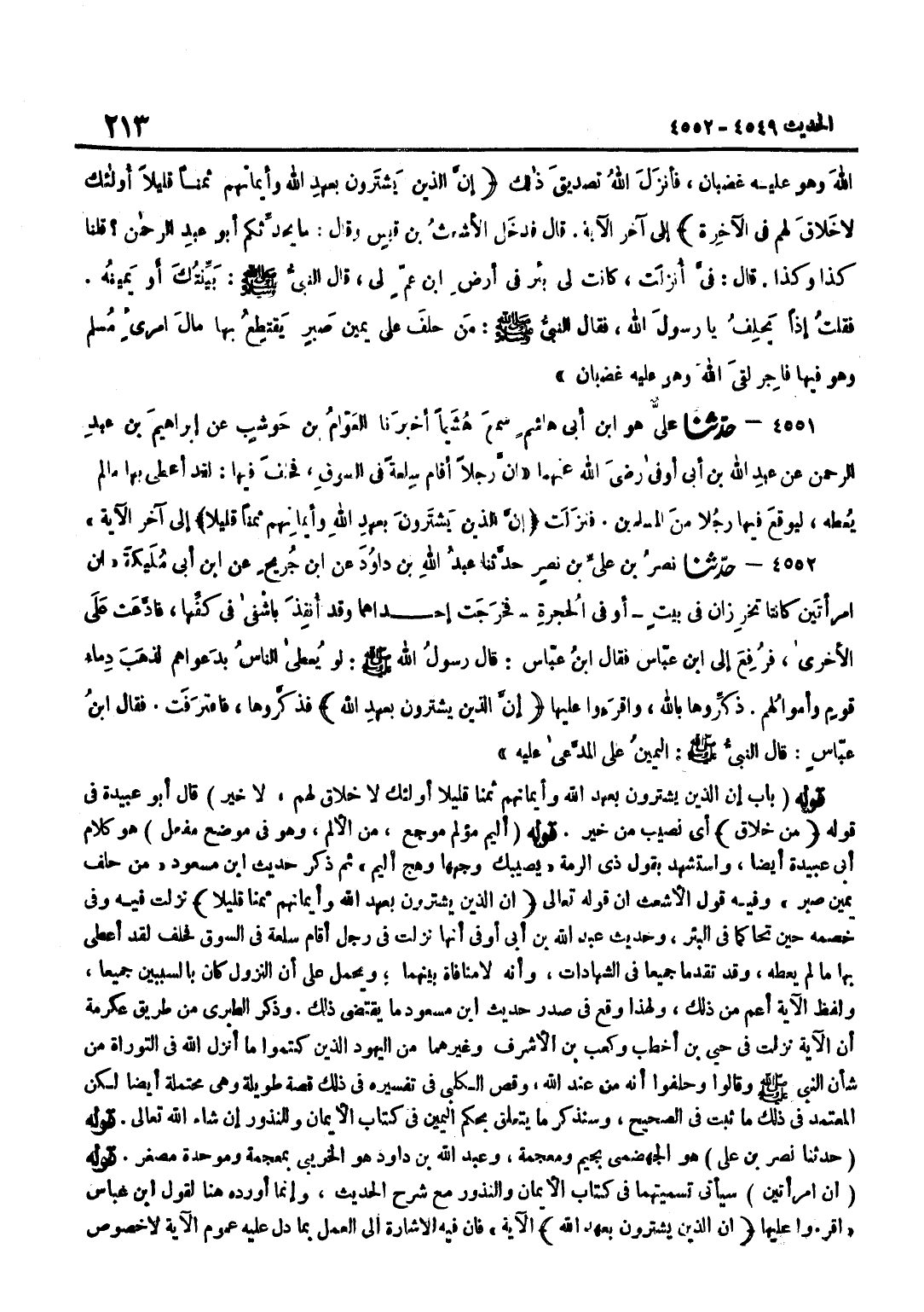 [4552] حَدَّثَنَا نَصْرُ بْنُ عَلِيٍّ هُوَ الْجَهْضَمِيُّ بِجِيمٍ وَمُعْجَمَةٍ وَعَبْدُ اللَّهِ بْنُ دَاوُدَ هُوَ الْخُرَيْبِيُّ بِمُعْجَمَةٍ وَمُوَحَّدَةٍ مُصَغَّرٌ قَوْلُهُ أَنَّ امْرَأَتَيْنِ سَيَأْتِي تَسْمِيَتُهُمَا فِي كِتَابِ الْأَيْمَانِ وَالنُّذُورِ مَعَ شرح الحَدِيث وَإِنَّمَا أوردهُ هُنَا لقَوْل بن عَبَّاس اقرؤوا عَلَيْهَا أَن الَّذين يشْتَرونَ بِعَهْد الله الْآيَةَ فَإِنَّ فِيهِ الْإِشَارَةَ إِلَى الْعَمَلِ بِمَا دَلَّ عَلَيْهِ عُمُومُ الْآيَةِ لَا خُصُوصُ