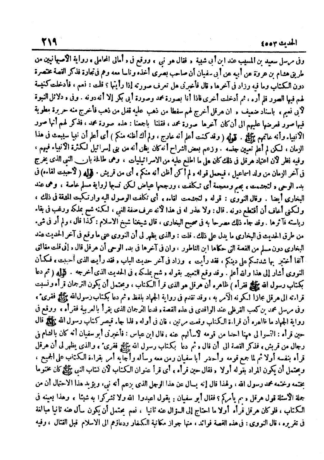 وَفِي مُرْسل سعيد بن الْمسيب عِنْد بن أَبِي شَيْبَةَ فَقَالَ هُوَ نَبِيٌّ وَوَقَعَ فِي أَمَالِي الْمَحَامِلِيِّ رِوَايَةَ الْأَصْبَهَانِيِّينَ مِنْ طَرِيقِ هِشَامِ بْنِ عُرْوَةَ عَنْ أَبِيهِ عَنْ أَبِي سُفْيَانَ أَنَّ صَاحِبَ بُصْرَى أَخَذَهُ وَنَاسًا مَعَهُ وَهُمْ فِي تِجَارَةٍ فَذَكَرَ الْقِصَّةَ مُخْتَصَرَةً دُونَ الْكِتَابِ وَمَا فِيهِ وَزَادَ فِي آخِرِهَا قَالَ فَأَخْبَرَنِي هَلْ تَعْرِفُ صُورَتَهُ إِذَا رَأَيْتَهَا قُلْتُ نَعَمْ فَأُدْخِلْتُ كَنِيسَةً لَهُمْ فِيهَا الصُّوَرُ فَلَمْ أَرَهُ ثُمَّ أُدْخِلْتُ أُخْرَى فَإِذَا أَنَا بِصُورَةِ مُحَمَّدٍ وَصُورَةِ أَبِي بَكْرٍ إِلَّا أَنَّهُ دُونَهُ وَفِي دَلَائِلِ النُّبُوَّةِ لِأَبِي نُعَيْمٍ بِإِسْنَادٍ ضَعِيفٍ إِنَّ هِرقل أخرج لَهُم سقطا مِنْ ذَهَبٍ عَلَيْهِ قُفْلٌ مِنْ ذَهَبٍ فَأَخْرَجَ مِنْهُ حَرِيرَةً مَطْوِيَّةً فِيهَا صُوَرٌ فَعَرَضَهَا عَلَيْهِمْ إِلَى أَنْ كَانَ آخِرُهَا صُورَةَ مُحَمَّدٍ فَقُلْنَا بِأَجْمَعِنَا هَذِهِ صُورَةُ مُحَمَّدٍ فَذَكَرَ لَهُمْ أَنَّهَا صُوَرُ الْأَنْبِيَاءِ وَأَنَّهُ خَاتَمُهُمْ صَلَّى اللَّهُ عَلَيْهِ وَسَلَّمَ قَوْلُهُ وَقَدْ كُنْتُ أَعْلَمُ أَنَّهُ خَارِجٌ وَلَمْ أَكُ أَظُنُّهُ مِنْكُمْ أَيْ أَعْلَمُ أَنَّ نَبِيًّا سَيُبْعَثُ فِي هَذَا الزَّمَانِ لَكِنْ لَمْ أَعْلَمْ تَعْيِينَ جِنْسِهِ وَزَعَمَ بَعْضُ الشُّرَّاحِ أَنَّهُ كَانَ يَظُنُّ أَنَّهُ مِنْ بَنِي إِسْرَائِيلَ لِكَثْرَةِ الْأَنْبِيَاءِ فِيهِمْ وَفِيهِ نَظَرٌ لِأَنَّ اعْتِمَادَ هِرَقْلَ فِي ذَلِكَ كَانَ عَلَى مَا اطَّلَعَ عَلَيْهِ مِنَ الْإِسْرَائِيلِيَّاتِ وَهِيَ طَافِحَةٌ بِأَنَّ النَّبِيَّ الَّذِي يخرج فِي آخِرِ الزَّمَانِ مِنْ وَلَدِ إِسْمَاعِيلَ فَيُحْمَلُ قَوْلُهُ لَمْ أَكُنْ أَظُنُّ أَنَّهُ مِنْكُمْ أَيْ مِنْ قُرَيْشٍ قَوْلُهُ لَأَحْبَبْتُ لِقَاءَهُ فِي بَدْءِ الْوَحْيِ لَتَجَشَّمْتُ بِجِيمٍ وَمُعْجَمَةٍ أَيْ تَكَلَّفْتُ وَرَجَّحَهَا عِيَاضٌ لَكِنْ نَسَبَهَا لِرِوَايَةِ مُسْلِمٍ خَاصَّةً وَهِيَ عِنْدَ الْبُخَارِيِّ أَيْضًا وَقَالَ النَّوَوِيُّ قَوْلُهُ لَتَجَشَّمْتُ لِقَاءَهُ أَيْ تَكَلَّفْتُ الْوُصُولَ إِلَيْهِ وَارْتَكَبْتُ الْمَشَقَّةَ فِي ذَلِكَ وَلَكِنِّي أَخَافُ أَنْ أُقْتَطَعَ دُونَهُ قَالَ وَلَا عُذْرَ لَهُ فِي هَذَا لِأَنَّهُ عَرَفَ صِفَةَ النَّبِيِّ لَكِنَّهُ شَحَّ بِمُلْكِهِ وَرَغِبَ فِي بَقَاء رياسته فآثرها وَقد جَاءَ ذَلِك مُصَرَّحًا بِهِ فِي صَحِيحِ الْبُخَارِيِّ قَالَ شَيْخُنَا شَيْخُ الْإِسْلَامِ كَذَا قَالَ وَلَمْ أَرَ فِي شَيْءٍ مِنْ طُرُقِ الْحَدِيثِ فِي الْبُخَارِيِّ مَا يَدُلُّ عَلَى ذَلِكَ قُلْتُ وَالَّذِي يَظْهَرُ لِي أَنَّ النَّوَوِيَّ عَنَى مَا وَقَعَ فِي آخِرِ الْحَدِيثِ عِنْدَ الْبُخَارِيِّ دُونَ مُسْلِمٍ مِنَ الْقِصَّةِ الَّتِي حَكَاهَا بن النَّاطُورِ وَأَنَّ فِي آخِرِهَا فِي بَدْءِ الْوَحْيِ أَنَّ هِرَقْلَ قَالَ إِنِّي قُلْتُ مَقَالَتِي آنِفًا أَخْتَبِرُ بِهَا شِدَّتَكُمْ عَلَى دِينِكُمْ فَقَدْ رَأَيْتُ وَزَادَ فِي آخِرِ حَدِيثِ الْبَابِ فَقَدْ رَأَيْتُ الَّذِي أَحْبَبْتُ فَكَأَنَّ النَّوَوِيَّ أَشَارَ إِلَى هَذَا وَاللَّهُ أَعْلَمُ وَقَدْ وَقَعَ التَّعْبِيرُ بِقَوْلِهِ شَحَّ بِمُلْكِهِ فِي الْحَدِيثِ الَّذِي أَخْرَجَهُ قَوْلُهُ ثُمَّ دَعَا بِكِتَابِ رَسُولِ اللَّهِ صَلَّى اللَّهُ عَلَيْهِ وَسَلَّمَ فَقَرَأَهُ ظَاهِرُهُ أَنَّ هِرَقْلَ هُوَ الَّذِي قَرَأَ الْكِتَابَ وَيَحْتَمِلُ أَنْ يَكُونَ التُّرْجُمَانُ قَرَأَهُ وَنُسِبَتْ قِرَاءَتُهُ إِلَى هِرَقْلَ مَجَازًا لِكَوْنِهِ الْآمِرَ بِهِ وَقَدْ تَقَدَّمَ فِي رِوَايَةِ الْجِهَادِ بِلَفْظِ ثُمَّ دَعَا بِكِتَابِ رَ