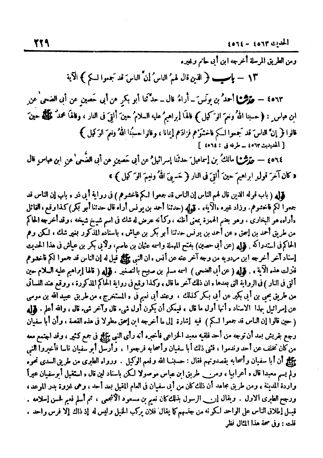 [4563] قَوْلُهُ حَدَّثَنَا أَحْمَدُ بْنُ يُونُسَ أُرَاهُ قَالَ حَدَّثَنَا أَبُو بَكْرٍ كَذَا وَقَعَ الْقَائِلُ أُرَاهُ هُوَ الْبُخَارِيُّ وَهُوَ بِضَمِّ الْهَمْزَةِ بِمَعْنَى أَظُنُّهُ وَكَأَنَّهُ عَرَضَ لَهُ شَكٌّ فِي اسْمِ شَيْخِ شَيْخِهِ وَقَدْ أَخْرَجَهُ الْحَاكِمُ مِنْ طَرِيقِ أَحْمَدَ بْنِ إِسْحَاقَ عَنْ أَحْمَدَ بْنِ يُونُسَ حَدَّثَنَا أَبُو بَكْرِ بْنُ عَيَّاشٍ بِإِسْنَادِهِ الْمَذْكُورِ بِغَيْرِ شَكٍّ لَكِنْ وَهِمَ الْحَاكِمُ فِي اسْتِدْرَاكِهِ قَوْلُهُ عَنْ أَبِي حَصِينٍ بِفَتْحِ الْمُهْمَلَةِ وَاسْمُهُ عُثْمَانُ بْنُ عَاصِمٍ وَلِأَبِي بَكْرِ بْنِ عَيَّاشٍ فِي هَذَا الْحَدِيثِ إِسْنَادٌ آخَرُ أخرجه بن مَرْدَوَيْهِ مِنْ وَجْهٍ آخَرَ عَنْهُ عَنْ أَنَسٍ أَنَّ النَّبِيَّ صَلَّى اللَّهُ عَلَيْهِ وَسَلَّمَ قِيلَ لَهُ إِنَّ النَّاسَ قَدْ جَمَعُوا لَكُمْ فَاخْشَوْهُمْ فَنزلت هَذِه الْآيَة قَوْله عَنْ أَبِي الضُّحَى اسْمُهُ مُسْلِمُ بْنُ صُبَيْحٍ بِالتَّصْغِيرِ قَوْلُهُ قَالَهَا إِبْرَاهِيمُ عَلَيْهِ السَّلَامُ حِينَ أُلْقِيَ فِي النَّارِ فِي الرِّوَايَةِ الَّتِي بَعْدَهَا إِنَّ ذَلِكَ آخِرُ مَا قَالَ وَكَذَا وَقَعَ فِي رِوَايَةِ الْحَاكِمِ الْمَذْكُورَةِ وَوَقَعَ عِنْدَ النَّسَائِيِّ مِنْ طَرِيقِ يَحْيَى بْنِ أَبِي بُكَيْرٍ عَنْ أَبِي بَكْرٍ كَذَلِكَ وَعِنْدَ أَبِي نُعَيْمٍ فِي الْمُسْتَخْرَجِ مِنْ طَرِيقِ عُبَيْدِ اللَّهِ بْنِ مُوسَى عَنْ إِسْرَائِيلَ بِهَذَا الْإِسْنَادِ أَنَّهَا أَوَّلُ مَا قَالَ فَيمكن أَن يكون أول شَيْء قَالَ وَآخِرُ شَيْءٍ قَالَ وَاللَّهُ أَعْلَمُ قَوْلُهُ حِينَ قَالُوا إِنَّ النَّاسَ قَدْ جَمَعُوا لَكُمْ فِيهِ إِشَارَة إِلَى مَا أخرجه بن إِسْحَاقَ مُطَوَّلًا فِي هَذِهِ الْقِصَّةِ وَأَنَّ أَبَا سُفْيَانَ رَجَعَ بِقُرَيْشٍ بَعْدَ أَنْ تَوَجَّهَ مِنْ أُحُدٍ فَلَقِيَهُ مَعْبَدٌ الْخُزَاعِيُّ فَأَخْبَرَهُ أَنَّهُ رَأَى النَّبِيَّ صَلَّى اللَّهُ عَلَيْهِ وَسَلَّمَ فِي جَمْعٍ كَثِيرٍ وَقَدِ اجْتَمَعَ مَعَهُ مَنْ كَانَ تَخَلَّفَ عَنْ أُحُدٍ وَنَدِمُوا فَثَنَى ذَلِكَ أَبَا سُفْيَانَ وَأَصْحَابَهُ فَرَجَعُوا وَأَرْسَلَ أَبُو سُفْيَانَ نَاسًا فَأَخْبَرُوا النَّبِيَّ صَلَّى اللَّهُ عَلَيْهِ وَسَلَّمَ أَنَّ أَبَا سُفْيَانَ وَأَصْحَابَهُ يَقْصِدُونَهُمْ فَقَالَ حَسْبُنَا اللَّهُ وَنِعْمَ الْوَكِيلُ وَرَوَاهُ الطَّبَرِيُّ مِنْ طَرِيقِ السُّدِّيِّ نَحْوَهُ وَلَمْ يُسَمِّ مَعْبَدًا قَالَ أَعْرَابِيًّا وَمَنْ طَرِيقِ بن عَبَّاسٍ مَوْصُولًا لَكِنْ بِإِسْنَادٍ لَيِّنٍ قَالَ اسْتَقْبَلَ أَبُو سُفْيَانَ عِيرًا وَارِدَةً الْمَدِينَةَ وَمِنْ طَرِيقِ مُجَاهِدٍ أَنَّ ذَلِكَ كَانَ مِنْ أَبِي سُفْيَانَ فِي الْعَامِ الْمُقْبِلِ بَعْدَ أُحُدٍ وَهِيَ غَزْوَةُ بَدْرٍ الْمَوْعِدِ وَرَجَّحَ الطَّبَرِيُّ الْأَوَّلَ وَيُقَالُ إِنَّ الرَّسُولَ بِذَلِكَ كَانَ نُعَيْمَ بْنَ مَسْعُودٍ الْأَشْجَعِيَّ ثُمَّ أَسْلَمَ نُعَيْمٌ فَحَسُنَ إِسْلَامُهُ قِيلَ إِطْلَاقُ النَّاسِ عَلَى الْوَاحِدِ لِكَوْنِهِ مِنْ جِنْسِهِمْ كَمَا يُقَال فُلَانٌ يَرْكَبُ الْخَيْلَ وَلَيْسَ لَهُ إِذْ ذَاكَ إِلَّا فَرَسٌ وَاحِدٌ قُلْتُ وَفِي صِحَّةِ هَذَا الْمِثَال نظر
