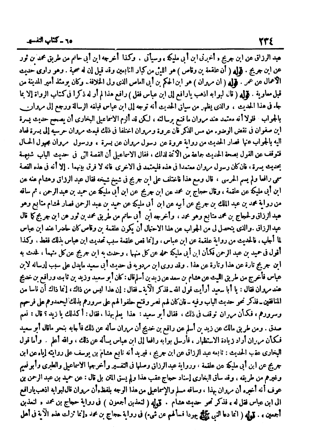 عبد الرَّزَّاق عَن بن جريج أَخْبرنِي بن أبي مليكَة وَسَيَأْتِي وَكَذَا أخرجه بن أَبِي حَاتِمٍ مِنْ طَرِيقِ مُحَمَّدِ بْنِ ثَوْرٍ عَن بن جُرَيْجٍ قَوْلُهُ أَنَّ عَلْقَمَةَ بْنَ وَقَّاصٍ هُوَ اللَّيْثِيُّ مِنْ كِبَارِ التَّابِعِينَ وَقَدْ قِيلَ إِنَّ لَهُ صُحْبَةً وَهُوَ رَاوِي حَدِيثِ الْأَعْمَالِ عَنْ عمر قَوْله أَن مَرْوَان هُوَ بن الْحَكَمِ بْنِ أَبِي الْعَاصِ الَّذِي وَلِيَ الْخِلَافَةَ وَكَانَ يَوْمَئِذٍ أَمِيرَ الْمَدِينَةِ مِنْ قِبَلِ مُعَاوِيَةَ قَوْلُهُ قَالَ لِبَوَّابِهِ اذْهَبْ يَا رَافِعُ إِلَى بن عَبَّاسٍ فَقُلْ رَافِعٌ هَذَا لَمْ أَرَ لَهُ ذكرا فِي كتاب الرُّوَاةِ إِلَّا بِمَا جَاءَ فِي هَذَا الْحَدِيثِ وَالَّذِي يَظْهَرُ مِنْ سِيَاقِ الْحَدِيثِ أَنَّهُ تَوَجَّهَ إِلَى بن عَبَّاسٍ فَبَلَّغَهُ الرِّسَالَةَ وَرَجَعَ إِلَى مَرْوَانَ بِالْجَوَابِ فَلَوْلَا أَنَّهُ مُعْتَمَدٌ عِنْدَ مَرْوَانَ مَا قَنَعَ بِرِسَالَتِهِ لَكِنْ قَدْ أَلْزَمَ الْإِسْمَاعِيلِيُّ الْبُخَارِيَّ أَنْ يصحح حَدِيث يسرة بْنِ صَفْوَانَ فِي نَقْضِ الْوُضُوءِ مِنْ مَسِّ الذَّكَرِ فَإِنَّ عُرْوَةَ وَمَرْوَانَ اخْتَلَفَا فِي ذَلِكَ فَبعث مَرْوَان حرسيه إِلَى يسرة فَعَادَ إِلَيْهِ بِالْجَوَابِ عَنْهَا فَصَارَ الْحَدِيثُ مِنْ رِوَايَة عُرْوَة عَن رَسُول مَرْوَان عَن يسرة وَرَسُولُ مَرْوَانَ مَجْهُولُ الْحَالِ فَتَوَقَّفَ عَنِ الْقَوْلِ بِصِحَّةِ الْحَدِيثِ جَمَاعَةٌ مِنَ الْأَئِمَّةِ لِذَلِكَ فَقَالَ الْإِسْمَاعِيلِيُّ إِنَّ الْقِصَّةَ الَّتِي فِي حَدِيثِ الْبَابِ شَبيهَة بِحَدِيث يسرة فَإِنْ كَانَ رَسُولُ مَرْوَانَ مُعْتَمَدًا فِي هَذِهِ فَلْيُعْتَمَدْ فِي الْأُخْرَى فَإِنَّهُ لَا فَرْقَ بَيْنَهُمَا إِلَّا أَنَّهُ فِي هَذِهِ الْقِصَّةِ سَمَّى رَافِعًا وَلَمْ يُسَمِّ الْحَرَسِيَّ قَالَ وَمَعَ هَذَا فَاخْتُلِفَ على بن جُرَيْجٍ فِي شَيْخِ شَيْخِهِ فَقَالَ عَبْدُ الرَّزَّاقِ وَهِشَام عَنهُ عَن بن أَبِي مُلَيْكَةَ عَنْ عَلْقَمَةَ وَقَالَ حَجَّاجُ بْنُ مُحَمَّد عَن بن جريج عَن بن أَبِي مُلَيْكَةَ عَنْ حُمَيْدِ بْنِ عَبْدِ الرَّحْمَنِ ثُمَّ سَاقَهُ مِنْ رِوَايَةِ مُحَمَّدِ بْنِ عَبْدِ الْملك بن جريج عَن أَبِيه عَن بن أَبِي مُلَيْكَةَ عَنْ حُمَيْدِ بْنِ عَبْدِ الرَّحْمَنِ فَصَارَ لِهِشَامٍ مُتَابِعٌ وَهُوَ عَبْدُ الرَّزَّاقِ وَلِحَجَّاجِ بن مُحَمَّد متابع وَهُوَ مُحَمَّد وَأخرجه بن أَبِي حَاتِمٍ مِنْ طَرِيقِ مُحَمَّدِ بْنِ ثَوْرٍ عَن بن جُرَيْجٍ كَمَا قَالَ عَبْدُ الرَّزَّاقِ وَالَّذِي يَتَحَصَّلُ لِي مِنَ الْجَوَابِ عَنْ هَذَا الِاحْتِمَالِ أَنْ يَكُونَ عَلْقَمَةُ بْنُ وَقَّاصٍ كَانَ حَاضِرًا عِنْدَ بن عَبَّاسٍ لَمَّا أَجَابَ فَالْحَدِيثُ مِنْ رِوَايَةِ عَلْقَمَةَ عَن بن عَبَّاس وَإِنَّمَا قصّ عَلْقَمَة سَبَب تحديث بن عَبَّاسٍ بِذَلِكَ فَقَطْ وَكَذَا أَقُولُ فِي حُمَيْدِ بن عبد الرَّحْمَن فَكَأَن بن أَبِي مُلَيْكَةَ حَمَلَهُ عَنْ كُلِّ مِنْهُمَا وَحَدَّثَ بِهِ بن جريج عَن كل مِنْهُمَا فَحدث بِهِ بن جُرَيْجٍ تَارَةً عَنْ هَذَا وَتَارَةً عَنْ هَذَا وَقَدْ روى بن مَرْدَوَيْهِ فِي حَدِيثِ أَبِي سَعِيدٍ مَا يَدُلُّ عَلَى سَبَبِ إِرْسَالِهِ لِابْنِ عَبَّاسٍ فَأَخْرَجَ مِنْ طَرِيقِ اللَّيْثُ عَنْ هِشَامِ بْنِ سَعْدٍ عَنْ زَيْدِ بْنِ أَسْلَمَ قَالَ كَانَ أَبُو سَعِيدٍ وَزَيْدُ بْنُ ثَابِتٍ وَرَافِعُ بْنُ خَدِيجٍ عِنْدَ مَرْوَانَ فَقَالَ يَا أَبَا سَعِيدٍ أَرَأَيْتَ قَوْلَ اللَّهِ فَذَكَرَ الْآيَةَ فَقَالَ إِنَّ هَذَا لَيْسَ مِنْ ذَاكَ إِنَّمَا ذَاكَ أَنَّ نَاسًا مِنَ الْمُنَافِقِينَ فَذَكَرَ نَحْوَ حَدِيثِ الْبَابِ وَفِيهِ فَإِنْ كَانَ لَهُمْ نَصْرٌ وَفَتْحٌ حَلَفُوا لَهُمْ عَلَى سُرُورِهِمْ بِذَلِ