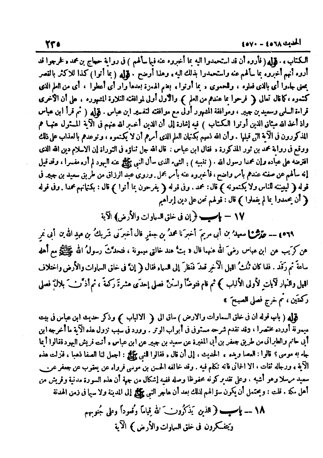 سَاق إِلَى الْأَلْبَاب وَذكر حَدِيث بن عَبَّاسٍ فِي بَيْتِ مَيْمُونَةَ أَوْرَدَهُ مُخْتَصَرًا وَقَدْ تَقَدَّمَ شَرْحُهُ مُسْتَوْفًى فِي أَبْوَابِ الْوِتْرِ وَوَرَدَ فِي سَبَبِ نُزُولِ هَذِهِ الْآيَةِ مَا أَخْرَجَهُ بن أَبِي حَاتِمٍ وَالطَّبَرَانِيُّ مِنْ طَرِيقِ جَعْفَرِ بْنِ أَبِي الْمُغِيرَةِ عَنْ سَعِيدِ بْنِ جُبَيْرٍ عَنِ بن عَبَّاسٍ أَتَتْ قُرَيْشٌ الْيَهُودَ فَقَالُوا أَيُّمَا جَاءَ بِهِ مُوسَى قَالُوا الْعَصَا وَيَدُهُ الْحَدِيثَ إِلَى أَنْ قَالَ فَقَالُوا لِلنَّبِيِّ صَلَّى اللَّهُ عَلَيْهِ وَسَلَّمَ اجْعَلْ لَنَا الصَّفَا ذَهَبًا فَنَزَلَتْ هَذِهِ الْآيَةُ وَرِجَالُهُ ثِقَاتٌ إِلَّا الْحِمَّانِيَّ فَإِنَّهُ تُكُلِّمَ فِيهِ وَقَدْ خَالَفَهُ الْحَسَنُ بْنُ مُوسَى فَرَوَاهُ عَنْ يَعْقُوبَ عَنْ جَعْفَرٍ عَنْ سَعِيدٍ مُرْسَلًا وَهُوَ أَشْبَهُ وَعَلَى تَقْدِيرِ كَوْنِهِ مَحْفُوظًا وَصْلُهُ فَفِيهِ إِشْكَالٌ مِنْ جِهَةِ أَنَّ هَذِهِ السُّورَةَ مَدَنِيَّةٌ وَقُرَيْشٌ مِنْ أَهْلِ مَكَّةَ قُلْتُ وَيَحْتَمِلُ أَنْ يَكُونَ سُؤَالُهُمْ لِذَلِكَ بَعْدَ أَنْ هَاجَرَ النَّبِيُّ صَلَّى اللَّهُ عَلَيْهِ وَسَلَّمَ إِلَى الْمَدِينَةِ وَلَا سِيمَا فِي زمن الْهُدْنَة