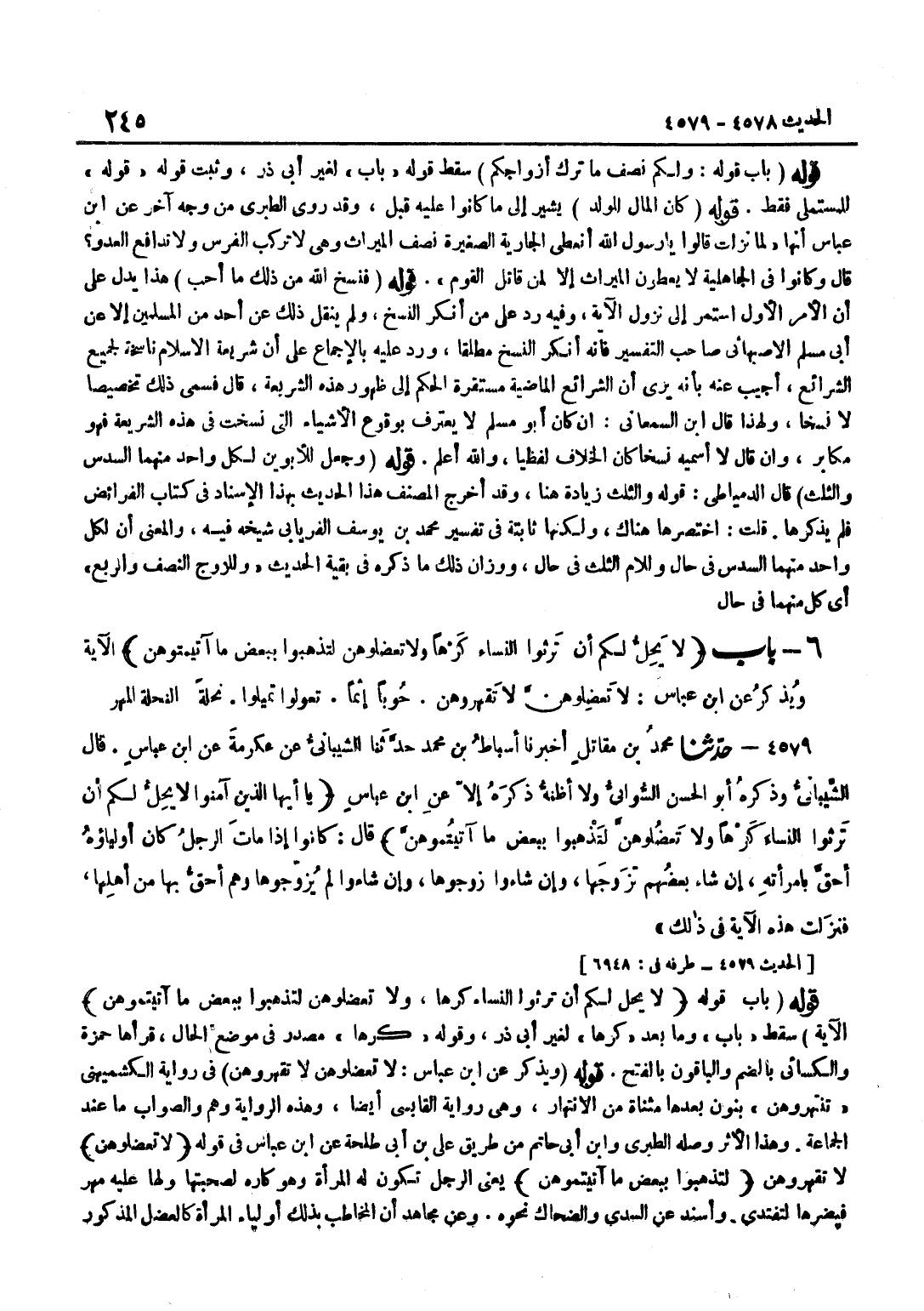 سَقَطَ بَابُ وَمَا بَعْدَ كَرْهًا لِغَيْرِ أَبِي ذَرٍّ وَقَوْلُهُ كَرْهًا مَصْدَرٌ فِي مَوْضِعِ الْحَالِ قَرَأَهَا حَمْزَةُ وَالْكِسَائِيُّ بِالضَّمِّ وَالْبَاقُونَ بِالْفَتْحِ قَوْله وَيذكر عَن بن عَبَّاسٍ لَا تَعْضُلُوهُنَّ لَا تَقْهَرُوهُنَّ فِي رِوَايَةِ الْكُشْمِيهَنِيِّ تَنْتَهِرُوهُنَّ بِنُونٍ بَعْدَهَا مُثَنَّاةٌ مِنَ الِانْتِهَارِ وَهِيَ رِوَايَةُ الْقَابِسِيِّ أَيْضًا وَهَذِهِ الرِّوَايَةُ وَهَمٌ وَالصَّوَابُ مَا عِنْدَ الْجَمَاعَةِ وَهَذَا الْأَثَرُ وَصَلَهُ الطَّبَرِيّ وبن أَبِي حَاتِمٍ مِنْ طَرِيقِ عَلِيِّ بْنِ أَبِي طَلْحَةَ عَنِ بن عَبَّاسٍ فِي قَوْلِهِ لَا تَعْضُلُوهُنَّ لَا تَقْهَرُوهُنَّ لِتَذْهَبُوا بِبَعْضِ مَا آتَيْتُمُوهُنَّ يَعْنِي الرَّجُلَ تَكُونُ لَهُ الْمَرْأَةُ وَهُوَ كَارِهٌ لِصُحْبَتِهَا وَلَهَا عَلَيْهِ مَهْرٌ فَيَضُرُّهَا لِتَفْتَدِيَ وَأَسْنَدَ عَنِ السُّدِّيِّ وَالضَّحَّاكِ نَحْوَهُ وَعَنْ مُجَاهِدٍ أَنَّ الْمُخَاطَبَ بِذَلِكَ أَوْلِيَاءُ الْمَرْأَةِ كَالْعَضْلِ الْمَذْكُورِ
