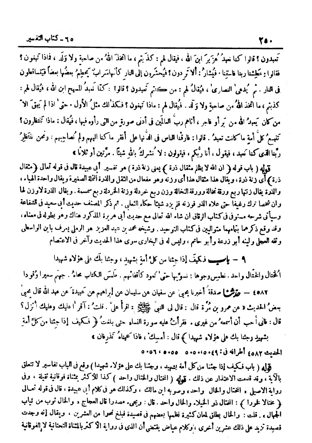 يَعْنِي زِنَةَ ذَرَّةٍ هُوَ تَفْسِيرُ أَبِي عُبَيْدَةَ قَالَ فِي قَوْلِهِ تَعَالَى مِثْقَالَ ذَرَّةٍ أَيْ زِنَةَ ذَرَّةٍ وَيُقَالُ هَذَا مِثْقَالُ هَذَا أَيْ وَزْنُهُ وَهُوَ مِفْعَالٌ مِنَ الثِّقَلِ وَالذَّرَّةُ النَّمْلَةُ الصَّغِيرَةُ وَيُقَالُ وَاحِدَةُ الْهَبَاءِ وَالذَّرَّةُ يُقَالُ زِنَتُهَا رُبُعُ وَرَقَةِ نُخَالَةٍ وَوَرَقَةُ النُّخَالَةِ وَزْنُ رُبُعِ خَرْدَلَةٍ وَزِنَةُ الْخَرْدَلَةِ رُبُعُ سِمْسِمَةٍ وَيُقَالُ الذَّرَّةُ لَا وَزْنَ لَهَا وَإِنَّ شَخْصًا تَرَكَ رَغِيفًا حَتَّى عَلَاهُ الذَّرُّ فَوَزَنَهُ فَلَمْ يَزِدْ شَيْئًا حَكَاهُ الثَّعْلَبِيُّ ثُمَّ ذَكَرَ الْمُصَنِّفُ حَدِيثَ أَبِي سَعِيدٍ فِي الشَّفَاعَةِ وَسَيَأْتِي شَرْحُهُ مُسْتَوْفًى فِي كِتَابِ الرِّقَاقِ إِنْ شَاءَ اللَّهُ تَعَالَى مَعَ حَدِيثِ أَبِي هُرَيْرَةَ الْمَذْكُورِ هُنَاكَ وَهُوَ بِطُولِهِ فِي مَعْنَاهُ وَقَدْ وَقَعَ ذِكْرُهُمَا بِتَمَامِهِمَا مُتَوَالِيَيْنِ فِي كِتَابِ التَّوْحِيدِ وَشَيْخُهُ مُحَمَّدُ بْنُ عَبْدِ الْعَزِيزِ هُوَ الرَّمْلِيُّ يُعْرَفُ بِابْنِ الْوَاسِطِيِّ وَثَّقَهُ الْعِجْلِيُّ وَلَيَّنَهُ أَبُو زُرْعَةَ وَأَبُو حَاتِمٍ وَلَيْسَ لَهُ فِي الْبُخَارِيِّ سِوَى هَذَا الْحَدِيثِ وَآخر فِي الِاعْتِصَام قَوْلُهُ بَابُ فَكَيْفَ إِذَا جِئْنَا مِنْ كُلِّ أُمَّةٍ بِشَهِيدٍ وَجِئْنَا بِكَ عَلَى هَؤُلَاءِ شَهِيدًا وَقَعَ فِي الْبَابِ تَفَاسِيرُ لَا تَتَعَلَّقُ بِالْآيَةِ وَقَدْ قَدَّمْتُ الِاعْتِذَارَ عَنْ ذَلِكَ قَوْلُهُ الْمُخْتَالُ وَالْخَتَّالُ وَاحِدٌ كَذَا لِلْأَكْثَرِ بِمُثَنَّاةٍ فَوْقَانِيَّةٍ ثَقِيلَةٍ وَفِي رِوَايَةِ الْأَصِيلِيِّ الْمُخْتَالُ وَالْخَالُ وَاحِدٌ وَصَوَّبَهُ بن مَالِكٍ وَكَذَلِكَ هُوَ فِي كَلَامِ أَبِي عُبَيْدَةَ قَالَ فِي قَوْلِهِ تَعَالَى مُخْتَالًا فَخُورًا الْمُخْتَالُ ذُو الْخُيَلَاءِ وَالْخَالُ وَاحِدٌ قَالَ وَيَجِيءُ مَصْدَرًا قَالَ العجاج وَالْخَال ثوب من ثِيَاب الْجُهَّال قُلْتُ وَالْخَالُ يُطْلَقُ لِمَعَانٍ كَثِيرَةٍ نَظَمَهَا بَعْضُهُمْ فِي قَصِيدَةٍ فَبَلَغَ نَحْوًا مِنَ الْعِشْرِينَ وَيُقَالُ إِنَّهُ وُجِدَتْ قَصِيدَةٌ تَزِيدُ عَلَى ذَلِكَ عِشْرِينَ أُخْرَى وَكَلَامُ عِيَاضٍ يَقْتَضِي أَنَّ الَّذِي فِي رِوَايَةِ الْأَكْثَرِ بِالْمُثَنَّاةِ التَّحْتَانِيَّةِ لَا الْفَوْقَانِيَّةِ